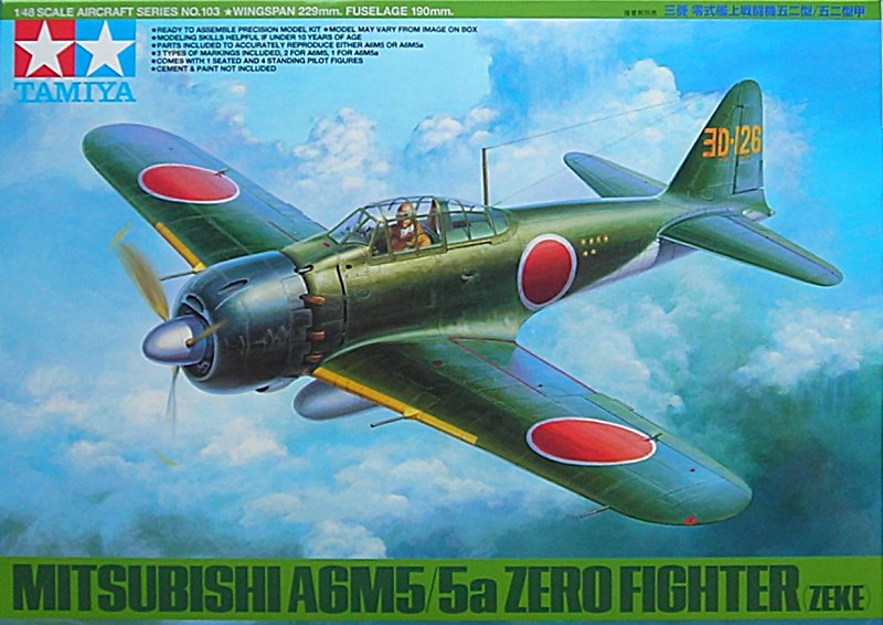 Bausatz Das nächste neue Modell nach dem 100. ist die Mitsubishi A6M-5 "Zero". Offensichtlich hat Tamiya das eigene 1/32er Modell als Vorbild genommen und "verkleinert". Dies ist besonders am toll detaillierten Cockpit zu sehen. Ebenso fällt sofort die starke Modularität ins Auge ... die Vermutung liegt nahe, dass noch weitere Versionen des 00 Jägers folgen werden. Drittes augenscheinliches Merkmal ist die Beigabe von 5 Pilotenfiguren, vier davon stehend.