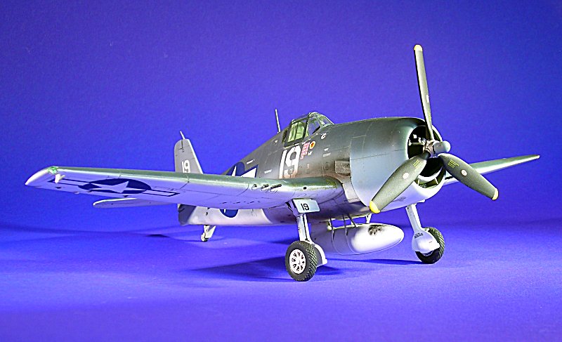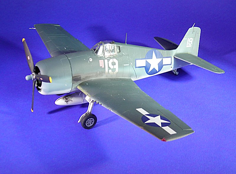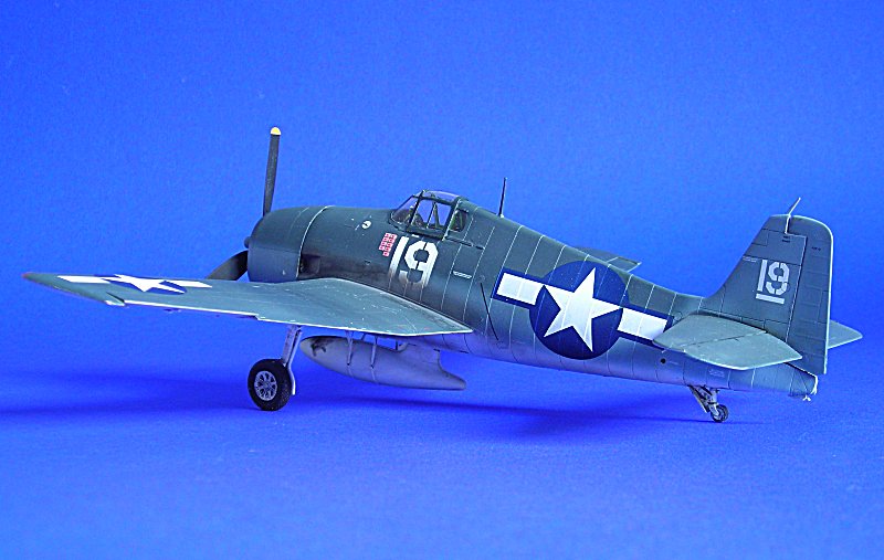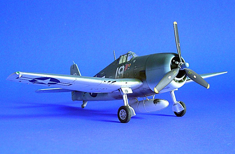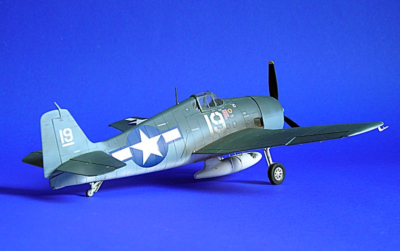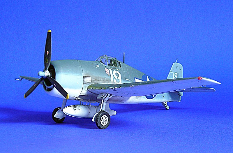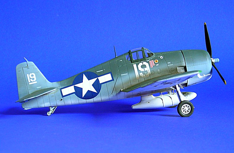 Bei den Flügeln gibt es noch ein Detail zu beachten, auf das die Bauanleitung leider nicht deutlich eingeht. Die ersten 272 Hellcats hatten den Landescheinwerfer unter dem Flügel (das runde "Loch") alle späteren den in der Tragflächenvorderkante. Also muss einer von beiden verschlossen werden ... das hatte ich natürlich verdösbaddelt und musste es jetzt an der bemalten Maschine machen. Nun kommen noch zwei Ergänzungen, die mir bei anderen Bauberichten aufgefallen sind. Der Zusatztank hat auf den meisten Fotos eine umlaufende Kante. Diese habe ich mit einem gezogenen Gussast dargestellt ... nicht ganz vorbildgerecht, aber besser als gar nicht. Eduard hat hier inzwischen mit einem Ätzteilsatz nachgeholfen. Weiterhin las ich in einem Forum, dass die Fahrwerksbeine etwas zu lang wären. Nach langem hin und her habe ich mich entschieden, diesen Umstand zu berücksichtigen .. die Hellcat sieht dadurch noch etwas bulliger aus.