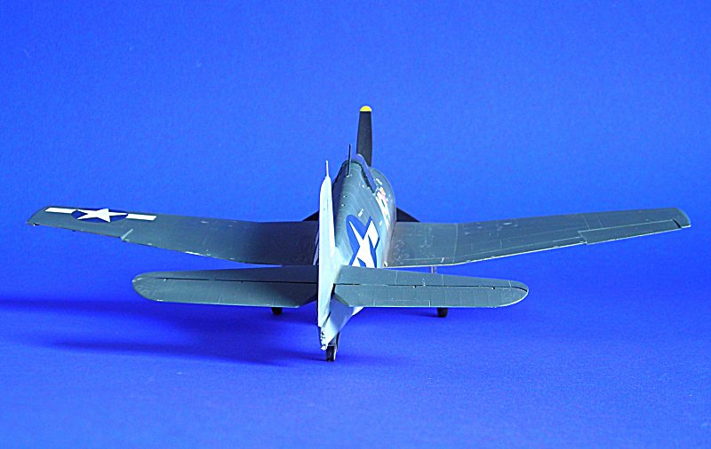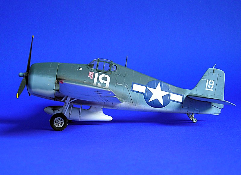 Schon konnte es an die Bemalung gehen. Ich habe die Unterseite des Modells weiß grundiert (Citadel) und die beiden Blautöne mit Farben von Jens Popp (JPS) und der Luftpistole gestaltet. Darauf folgte eine Schicht Klear (aka Future - Glanzlack). Die größeren Decals habe ich mittels Daco aufgebracht und diesmal gut durchtrocknen lassen (siehe Wildcatbericht). Bei den vielen kleinen Wartungsmarkierungen habe ich es mal mit Klear als "Setting Solution" probiert und es hat wunderbar geklappt .. absolut kein silbern und das Abziehbild wurde praktisch in die unterliegende Glanzlackschicht eingebettet.
