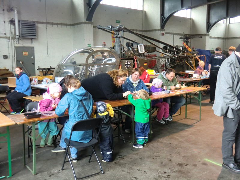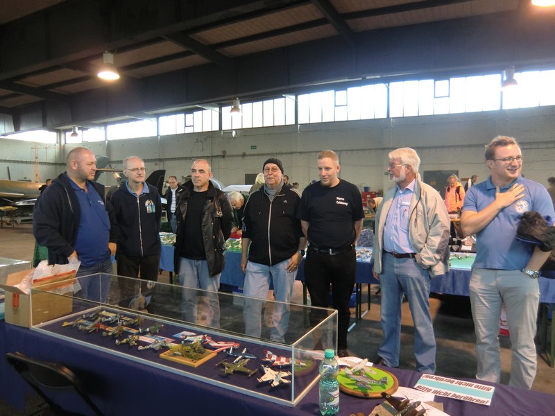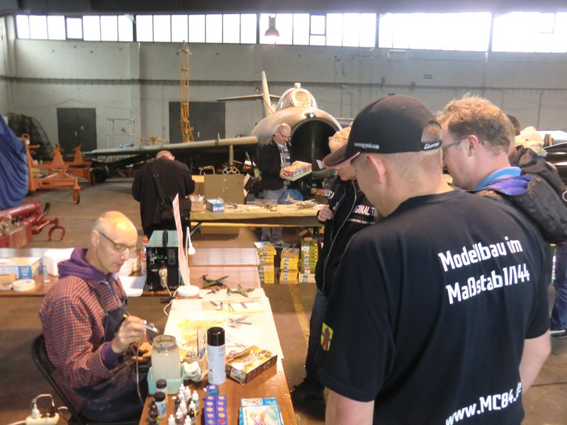 Unsere Ausstellung findet seit einiger Zeit in einem Depothangar statt. Ein Teil der restaurierten dort eingelagerten Maschinen machte Platz für unsere Tische. Vieles ist dadurch recht großzügig. Neben dem Haupteingang hatten wir eine Schnuppermodellbauecke für die ganze Familie eingerichtet. Auf den 15 Plätzen konnten Eltern gemeinsam mit ihren Kindern diverse Modelle von Airfix, Faller und Revell bauen. Unser Team hatte mehr als genug zu tun und mehr als hundert Bausätze verwandelten sich in ansprechende Modelle in den Händen strahlender Kinderaugen. Für die Kinderkrebshilfe kamen 160 € zusammen. Mein Dank geht hier insbesondere an Dani und Tina für die tolle Standbetreuung.