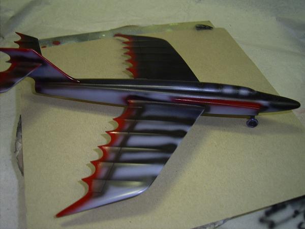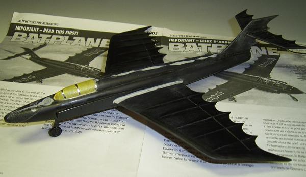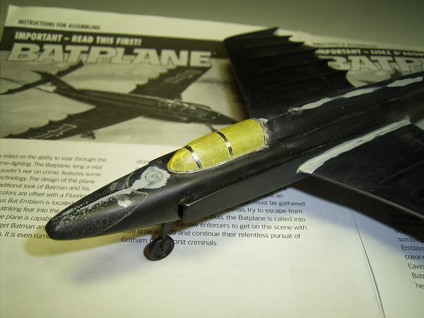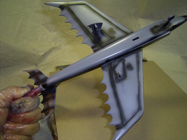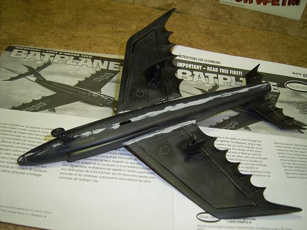Wenn so der Vogel fertig vorbereitet ist, wird er erst mal grundiert, um zu sehen ob alles für die abschließende Lackierung getan wurde. Bei der Farbwahl des Batplane habe ich lange überlegt. Denn einfach schwarz oder blau sollte es nicht sein. Anregungen für den Farbanstrich fand ich im Internet, man sollte nicht glauben wie viele Seiten einem angezeigt werden, unter dem Begriff: Batplane! Ich habe dann alle tiefer gelegenen Stellen am Modell, mit Schwarzchrom (TESTOR - MODEL MASTER), per Airbrush unterlegt. Danach werden ganz im Still der TV - Serie, die Flügelkanten in Garderot (TESTORS) versehen. Den Abschluss der Lackierung bildet ein teilweise deckender Farbauftrag aus Kopenhagenblau Metallic (leider nicht mehr im TESTORS Programm erhältlich!). Dieser fast schwarze Blauton steht dem Batplane sehr gut. Leider sind die erhofften Schattierungen nur bei starkem Licht zu sehen. Lackiert wurde alles ohne Abkleben der Flügelkanten, um einen fließenden Übergang zu erreichen. Nach ausreichender Trockenzeit wurden die letzten Kleinteile (Jetdüse, Räder, Die Spitze der Rumpfnase) montiert, dann wird noch die gesamte Oberfläche mit feiner Schleifpaste (TAMIYA Compound) bearbeitet. So werden eventuelle Sprühnebel beseitigt und man erhält eine glatte Oberfläche.