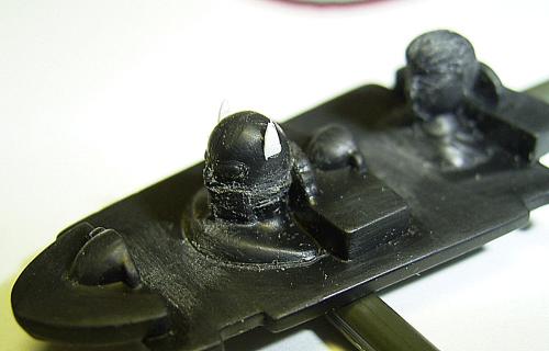 Ich habe das Cockpitrelief etwas überarbeitet, um Batman und Robin auch noch später zu erkennen (wer möchte kann auch den gesamten Cockpitbereich neu erstellen). Bei den Figuren wurden am Kopf von Batman die Fledermausohren neu angefertigt (mittels dünnen Plastikstreifen), Robin wurde im Bereich seiner Gesichtsmaske überarbeitet. Abschließend wurden nur die Vertiefungen im Relief nachgraviert. Die etwas aufwendige Bearbeitung und Bemalung der Figuren entscheidet doch sehr über den späteren Gesamteindruck des Modells.