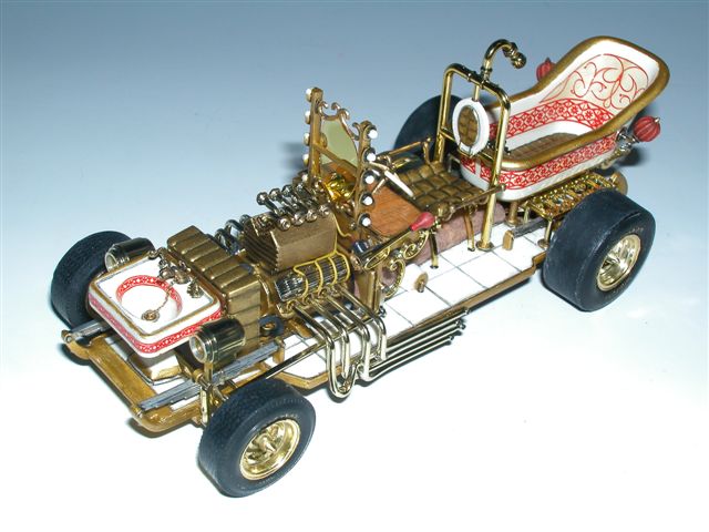 Lackiert wurde das Gefährt mit Gold + Klarlack von Tamiya (Aufbauten etc.), Elfenbein von Humbrol (Badewanne, Waschtisch) und Reichbleichgold von Eckart Classica (bekommt man bei Zinnfiguren Scholz) für Details.