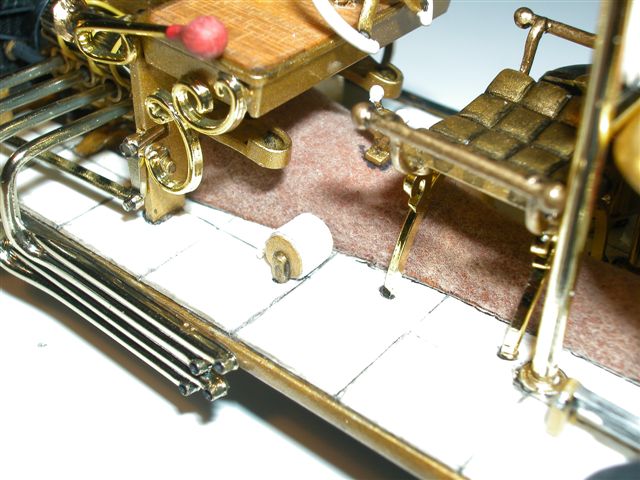 Bei den Aufbauten bekam der Schminktisch eine Holzfurnierauflage und neue Instrumente, der Waschtisch erhielt eine Kette zum "Stöpsel". Auch konnte ich es mir nicht nehmen lassen die seitlich am Schminktisch angebrachte Hupe vorn aufzubohren (was so bei allen anderen Rohren und Armaturen erfolgte). Als letzten Gimmick wurden die zwei Fußstützen mit dünnem Papier versehen, damit sie auch wie Toilettenpapierrollen aussehen.