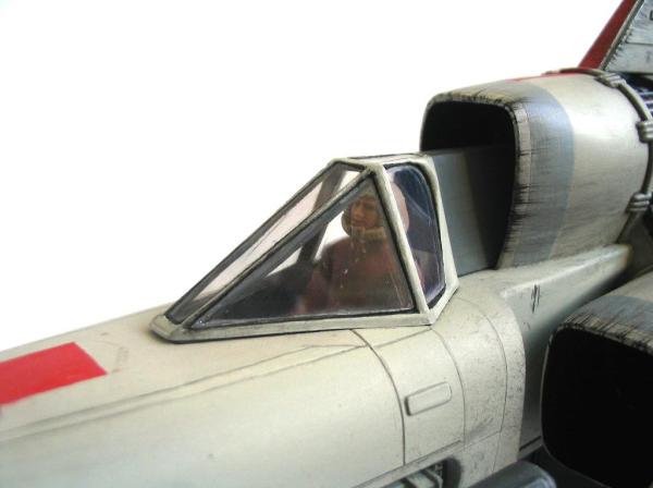 Zuerst fräste ich die Scheiben aus, so das nur ein Rahmen übrig blieb. Nun sägte ich aus dem Klarsichtdeckel einer CD-Hülle passende Scheiben heraus und befeilte sie so lange, bis sie in etwa in diesen Rahmen hinein passten. Als Pilot wählte ich einen modernen US Marine in 1/35, der so zusammengeklebt wurde, daß er bequem im Cockpit Platz fand, bastelte fix noch einen Pilotensitz dazu, steckte ihm ein umgedrehtes MG als Steuerknüppel zwischen die Beine und fertig ... fast. Etwas schwierig war es, den Helm zu modellieren, der ja wie eine Pharaonenhaube aussieht und natürlich mußte die Fliegerkombi des Viperpiloten aus der Figur herausgearbeitet werden.