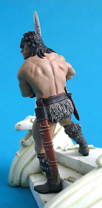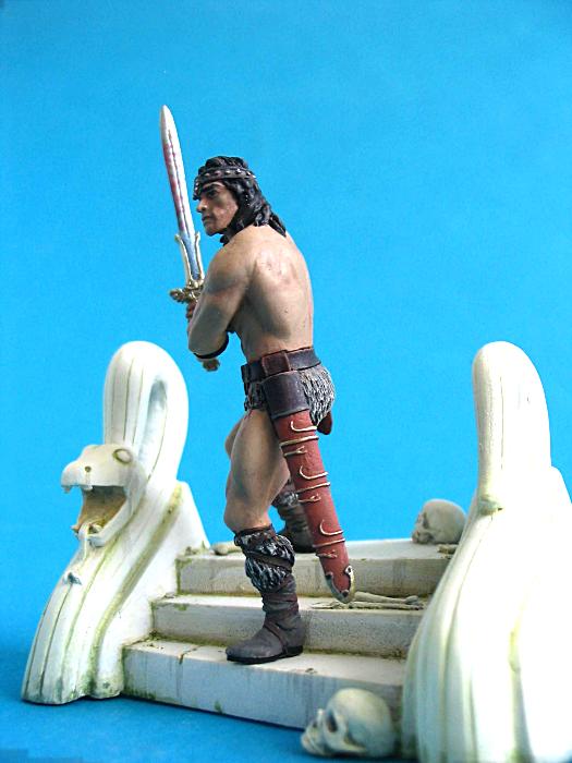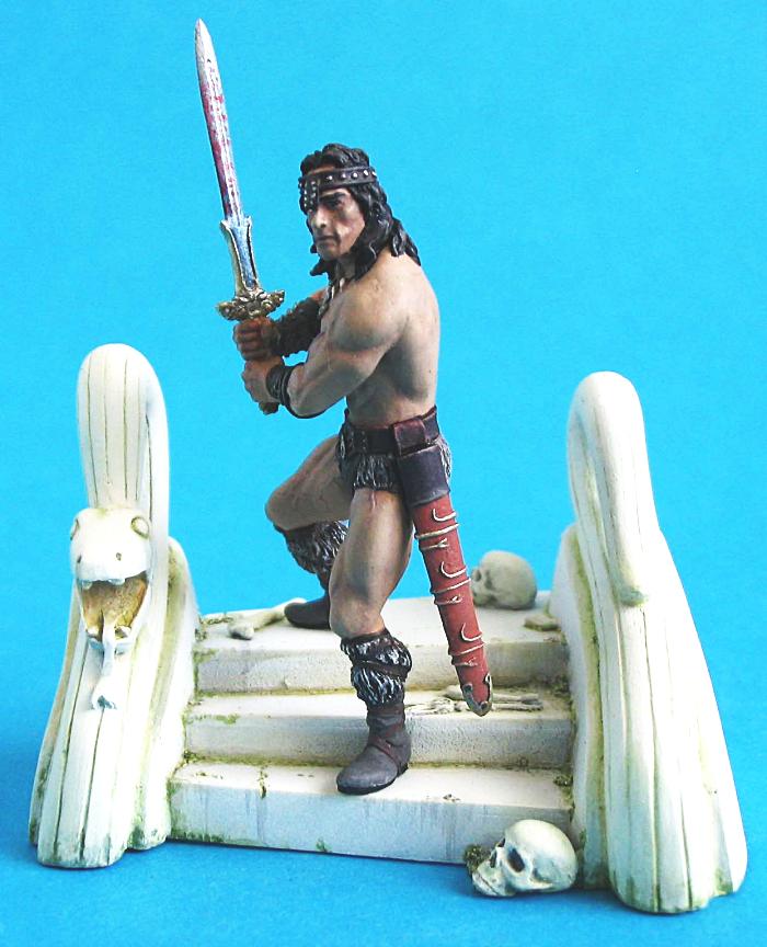 Die von Andrea vorliegende 54 mm Zinnminiatur hat diesen Moment sehr lebensnah eingefangen. Grimmig blickend stapft der Held mit gezücktem Schwert die Stufen der Schlangentreppe hinunter,die zum Thronsaal führt. Überall liegen Reste armer Opfer, die von dem Magier, der sich bei Bedarf in eine riesige Schlange verwandeln kann, gefressen worden sind.