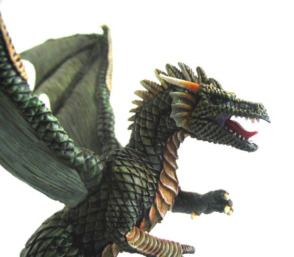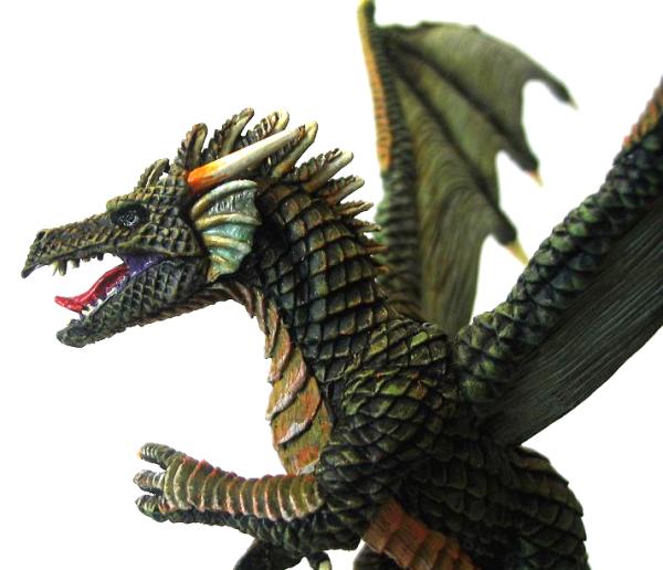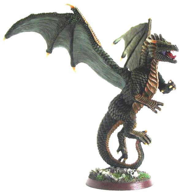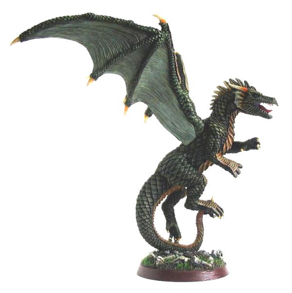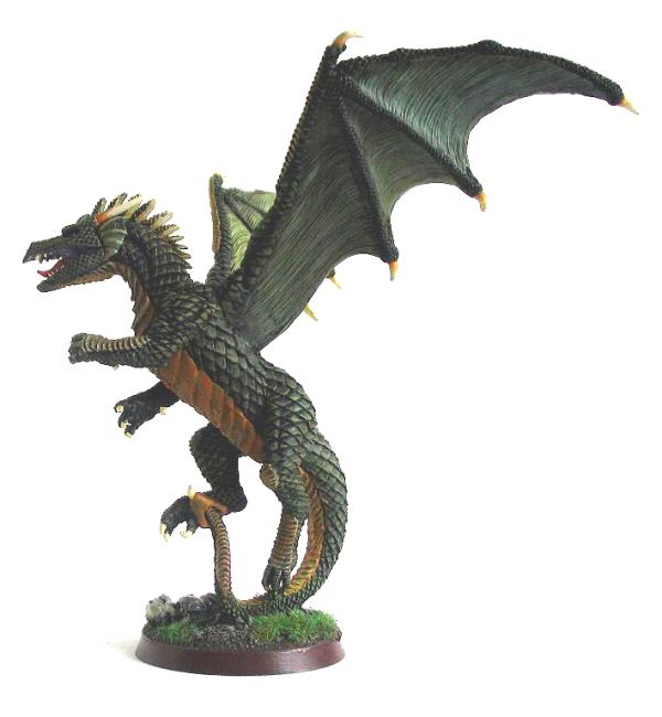 Grundiert wurde wieder mit dem bewärten Primer von Citadel, dieses mal schwarzem...das erleichterte das anschließende bemalen bedeutend! Mit diversen Grüntönen wurde der ganze Drache trocken gemalt, dabei von dunkel nach hell vorgehend. Am Schluß kamen noch die kleinen Details an die Reihe, Augen, Maul und Klauen.