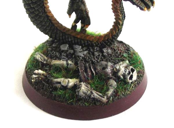 Den Sockel aus Plastik besorgte ich mir separat von der Firma Citadel, da der angegossene aus Zinn zu klein war und nicht genug Stabilität geboten hätte! Da nun auf dem größeren Sockel entsprechend mehr Platz war, drapierte ich noch ein "armes Opfer" zu Füssen des Ungeheuers...ein Skelett mit Rüstung aus der Grabbelkiste. Dieses bestand zum Glück auch aus Zinn und ließ sich einfach in die passende Lage biegen und etwas flach drücken. Mit Sekundenkleber fixierte ich dieses und einige Steinchen und Sand so, daß der übergang zu dem kleineren Zinnsockel überkaschiert wurde!