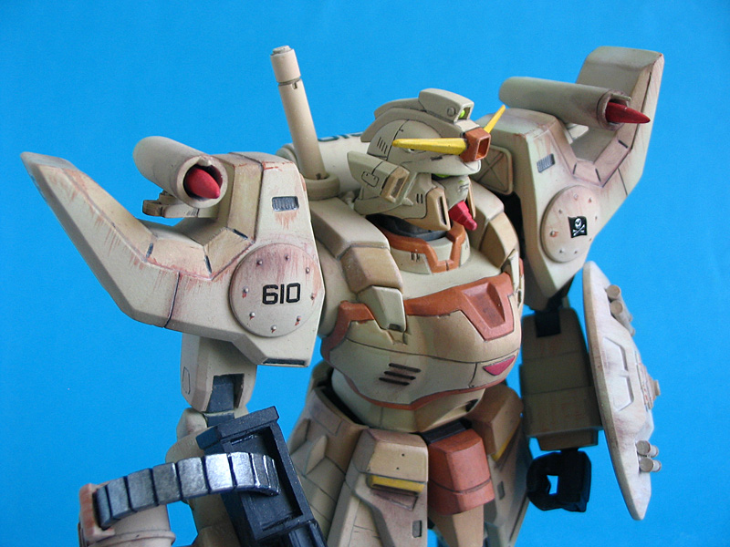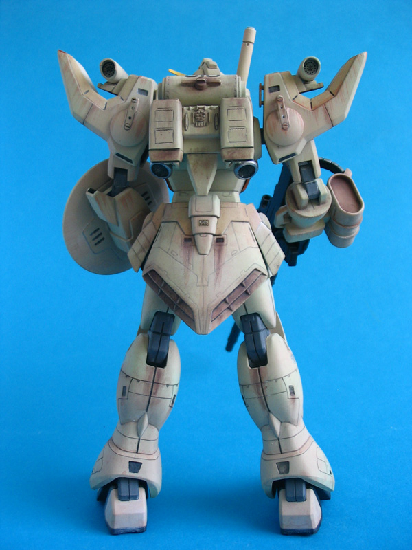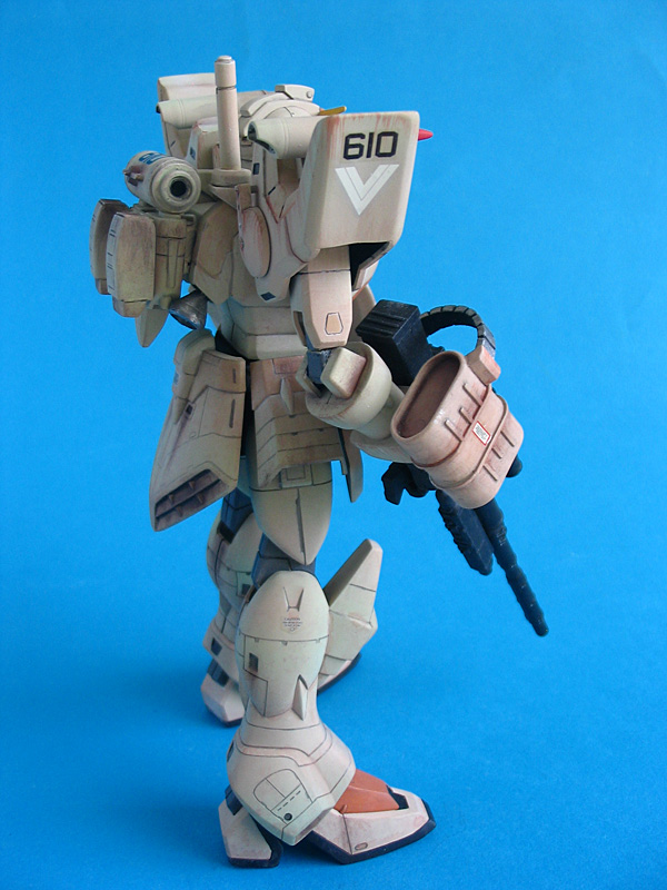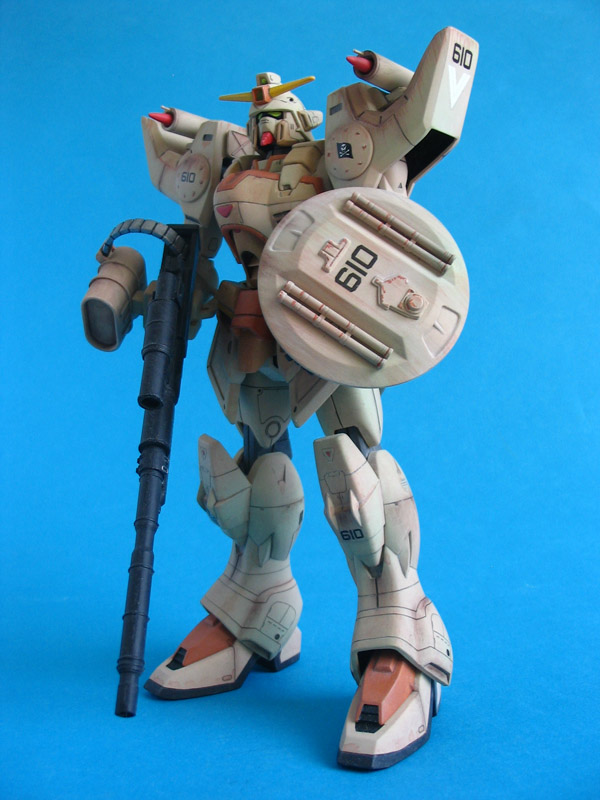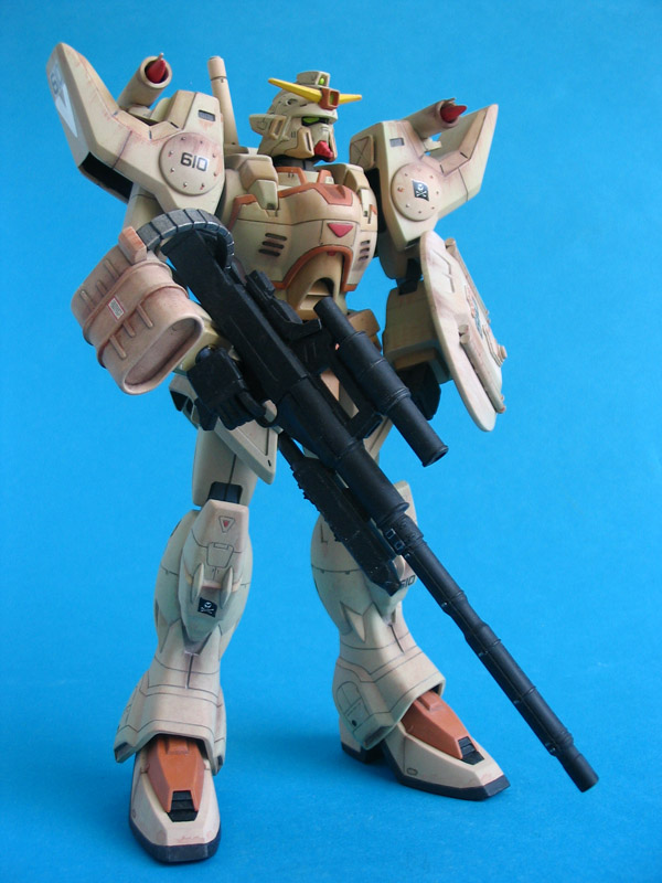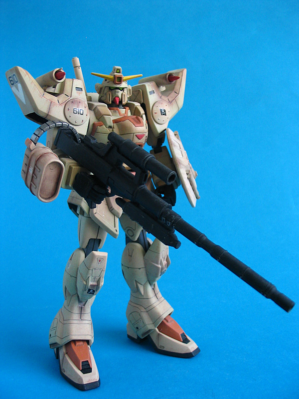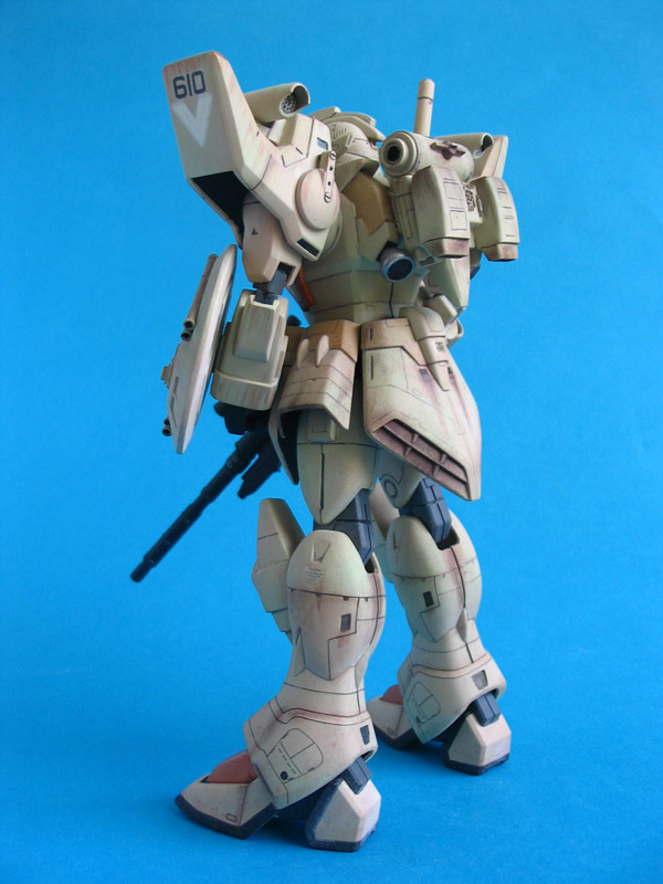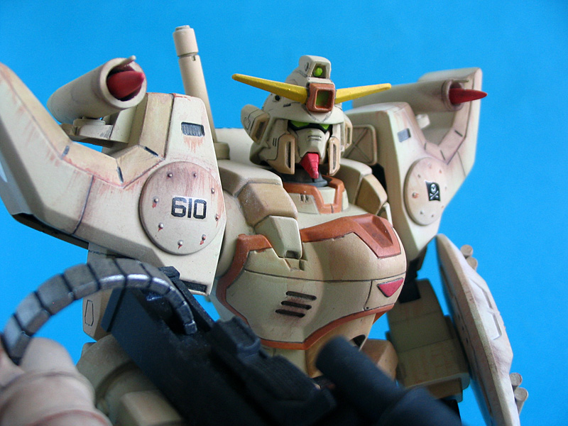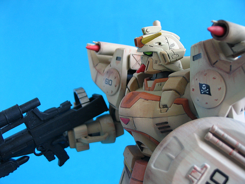 Die Schultern wurden geschlossen, der Raketenwerfer oben drauf kam von einem Hubschrauber, die Halterung war ein Schleudersitz in 1/72. Der Antrieb auf dem Rücken entstand ebenfalls aus Helikopter-Teilen. Das Lichtschwert kam von einem anderen Gundam. Für die Waffe wurden Teile einer Gundam-Kanone mit dem Rohr des 1/35 Leopard, einer Rakete und einem 1/48 Schleudersitz kombiniert. Das Magazin entstand aus zwei Triebwerksdüsen, die mit der Öffnung aneinander geklebt wurden und so den Behälter bildeten. Der Munitionsgurt war ein PS-Profil von Evergreen mit eingefeilten Riefen das über einer Kerze gebogen wurde. Ansonsten platzierte ich noch diverse Kleinteile aus der Grabbelbox auf der Oberfläche ... ohne allerdings dabei zu übertreiben, der Ursprung sollte noch erkennbar bleiben.