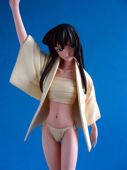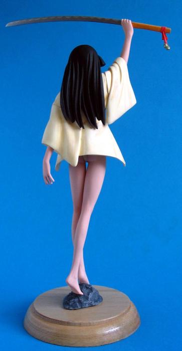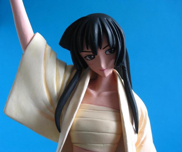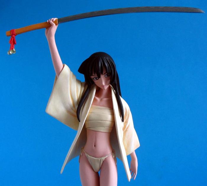 Und hier kommen wir nun zur vorliegenden Figur der Motoko Aoyama, die ebenfalls im Hinata Hotel wohnt. Sie entstammt einer uralten Kriegerfamilie und führt ständig ein Shirasaya, ein verborgenes Schwert, mit sich. Es sieht aus wie ein hölzernes Übungsschwert(Boken), beinhaltet aber eine scharfe Klinge.