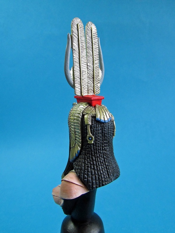 Die Büste selbst besteht aus einem sauber und ohne Lufteinschlüsse gegossenem Resin, die Krone und Kopf sowie Schwanz der Geier-Haube aus Weißmetall. Als Sockel nutzte ich einen umgedrehten Plastikbecher, auf dem die Büste einfach festgeschraubt wurde.