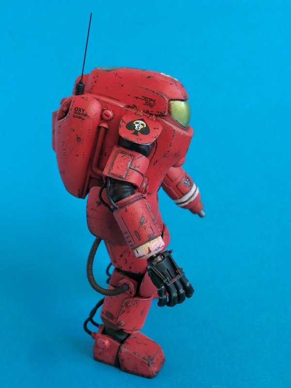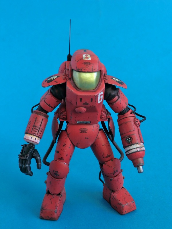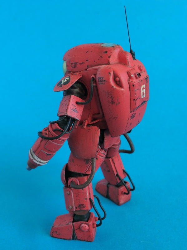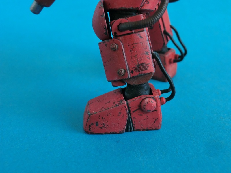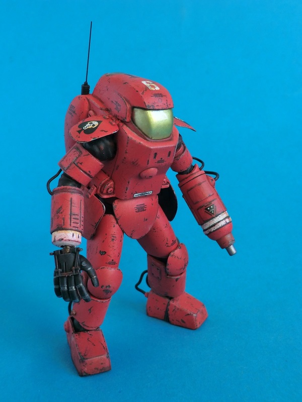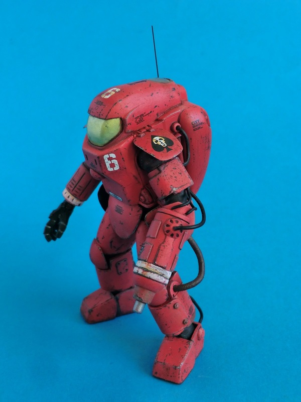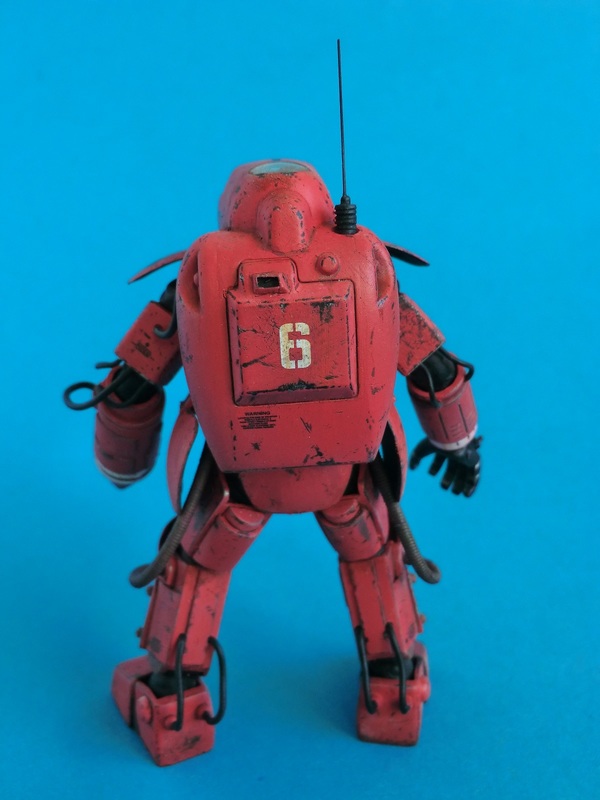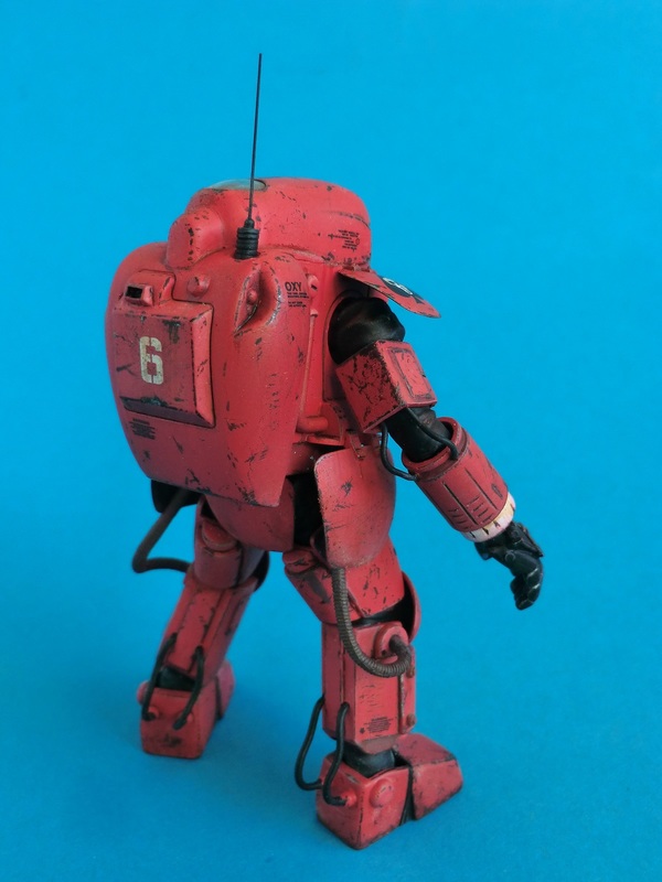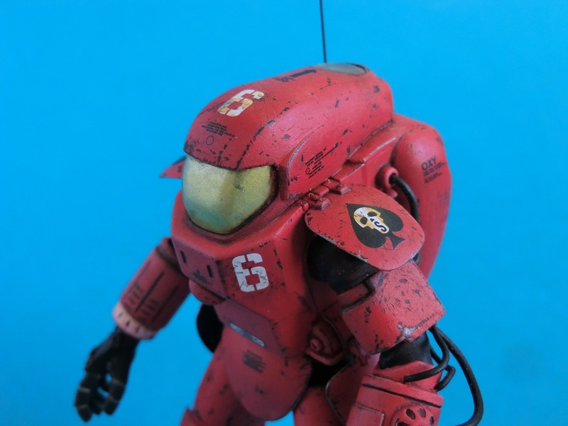 Ich entschied mich für die rote Farbvariante des Wachschutzes...nach den ganzen Tarnschemen mal etwas ausgefallenes. Über einer schwarzen Grundierung wurde das Rot mit der Airbrush aufgetragen. Die Beschädigungen sind nicht aufgemalt sondern von Hand mit verschiedenen Werkzeugen in die Farbschicht eingekratzt worden. Dabei nutze ich den Umstand, dass der Sprühgrund auf Lösemittelbasis fester ist als die darüber liegende Farbschicht aus Acryl. So lassen sich sehr leicht Farbabplatzer, Kratzer und Scheuerstellen darstellen. Bei den Decals hielt ich mich an die Datenkarte des Bausatzes und erstellte Suit No.6 der 242th armored S squadron "Space once - skelletons". Abschließend wurde das Modell mit Filtern und Pigmenten noch dezent gealtert.