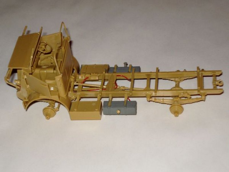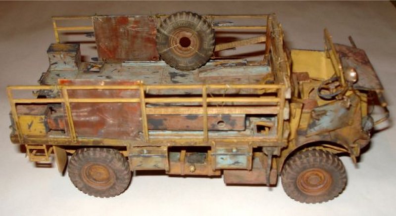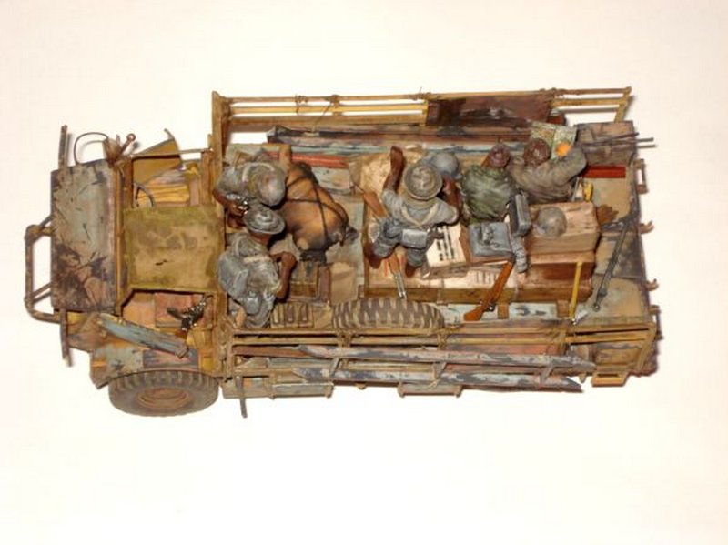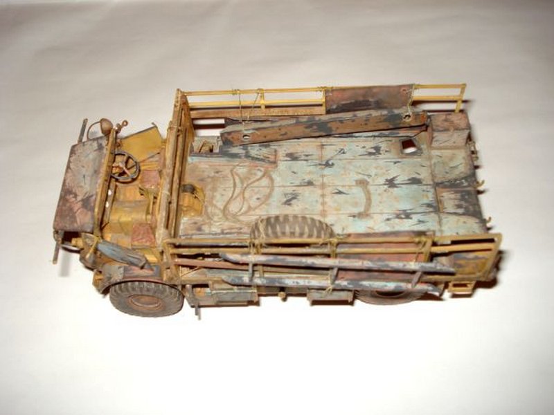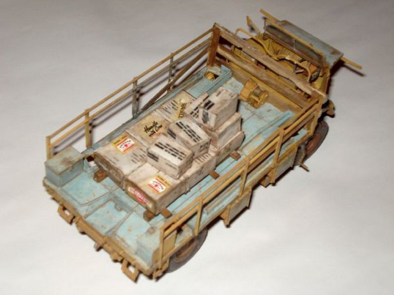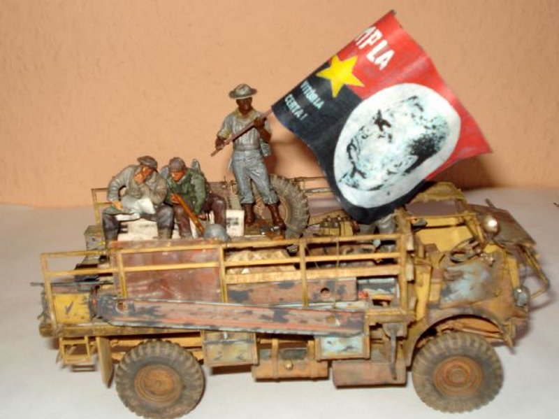 Der Bedford QL ist der AIRFIX-Kit aus den 70ern. Figuren sind Tamiya, Matchbox, Airfix. Da ich nicht die xte Variante des Bedford QL Gun Portee bauen wollte habe ich ihn "entmilitarisiert" (also alle Haltevorrichtungen für das Geschütz entfernt) und mit Benzinleitungen, usw. versehen. Die Pedale habe ich auch ergänzt. Die Bemalung erfolgte zunächst in Sand und Braun. Anschließend Übermalung mit Hellblau, dann Gebrauchsspuren und Verschmutzung. Die Ladebordwände sind aus Echtholz neu gefertigt, die Schilde aus Alu. Die Fahne der MPLA musste ich freihändig malen, da der Drucker nicht mehr mochte.