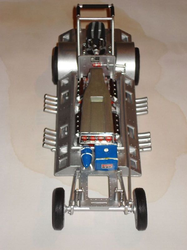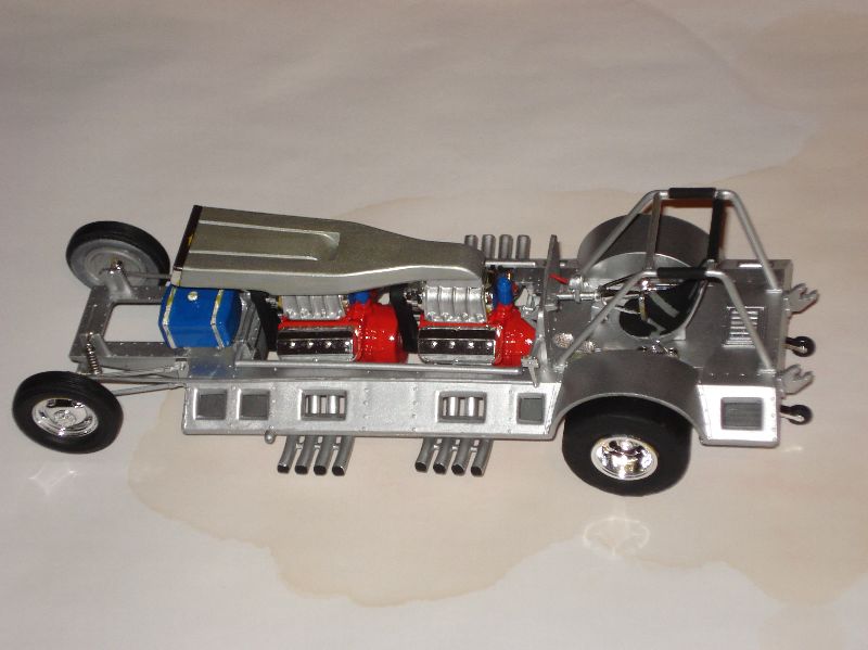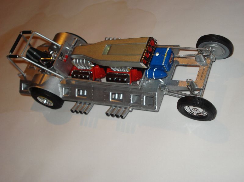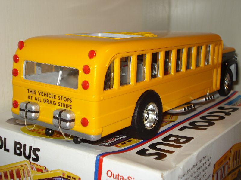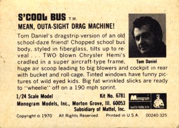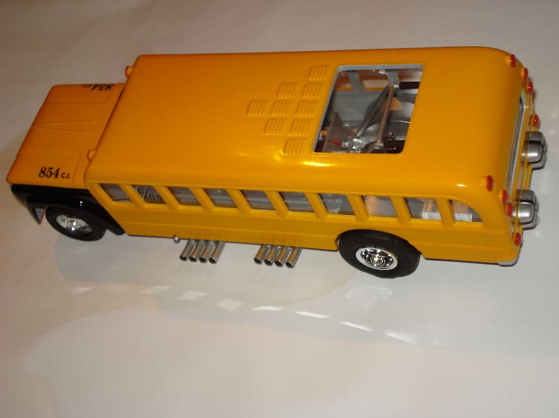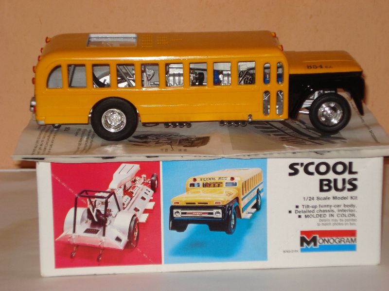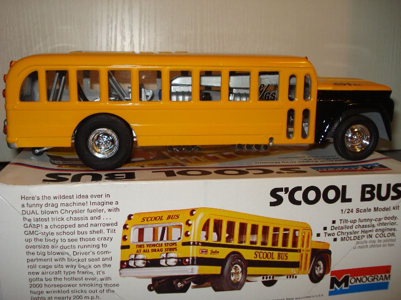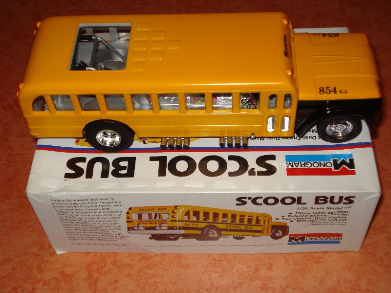 Hallo Leute. Hier ist mal was Ziviles aus den frühen 70ern: meine S`cool Bus-Interpretation. Orginalbilder zu diesem Dragster hab ich leider nicht finden können, daher habe ich auch auf Verkabelung usw. absichtlich verzichtet. Zumal wichtige Bauteile dafür sowieso fehlen. Die Modellform ist von Monogram 1970, der hier ist die 1973-Version. Einziger "Meckerpunkt" waren die hinteren Rennwalzen....zweiteilig und asymetrisch....völlig daneben. Habe das Elend mit Tesafilm und Holzleim kaschiert. So.... nun ein paar Bilder.