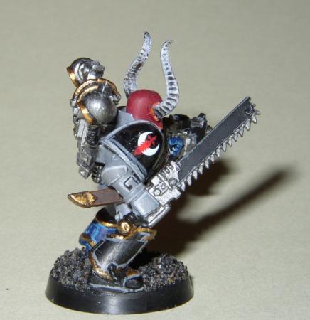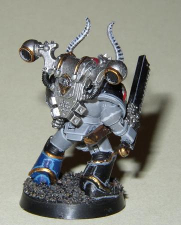 Dieser Spacemarine ist mit den Nahkampfwaffen - Kettenschwert und Boltpistole - ausgerüstet. Die Figur habe ich selbst gestaltet. Grundlage ist ein Spacemarine der ein erbeutetes Chaosrückenmodul und -beinschienen trägt. Der Helm wurde durch einen der Fantasiereihe ersetzt.