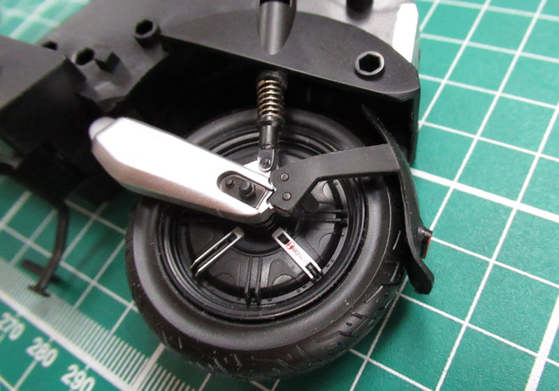 Der Zusammenbau funktioniert sehr gut nach der Bauanleitung und beginnt mit der Teleskopgabel. Hier gibt es sogar eine versteckte Federung. Gelungen ist der aus einem Teil bestehende Lenker. Auch das Rad mit Scheibenbremse ist toll. Die Reifen besitzen ein schönes vorbildgerechtes Profil und lassen sich leicht aufziehen. Auch die Heckschwinge ist gefedert. Ist alles mit dem Rahmen verbunden hat man die erste Hürde gewonnen. Dann fällt auch die vordere Gabel nicht mehr auseinander.