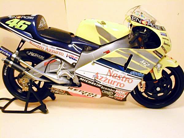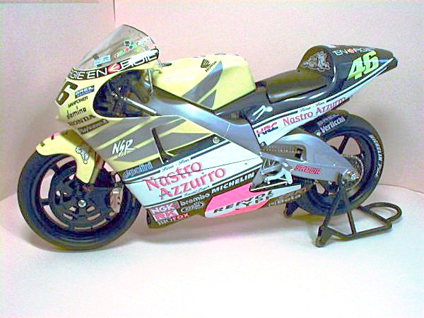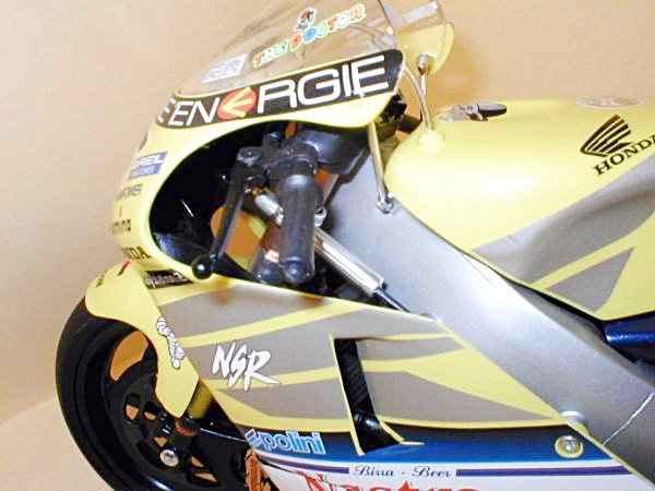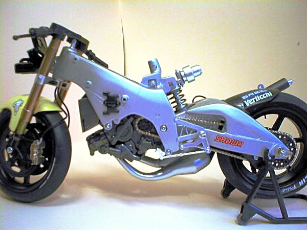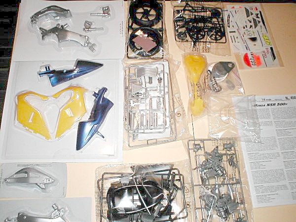 Das Öffnen des separaten Deckels gibt den Blick auf sorgsam einzeln verschweißte Verkleidungs- und Rahmenteile frei. Die Teile des Rahmens und der Schwinge sind aus Aluminium und werden mittels kleiner Schrauben, die dem Bausatz ebenfalls beiliegen, zusammengefügt. Dem Bausatz liegt eine ausführlich bebilderte, übersichtliche Bauanleitung und Selbstklebebilder für die Decals bei. Als Spezialfeature ist eine CD-Rom mit Bildern der Originalrennmaschine beigefügt.