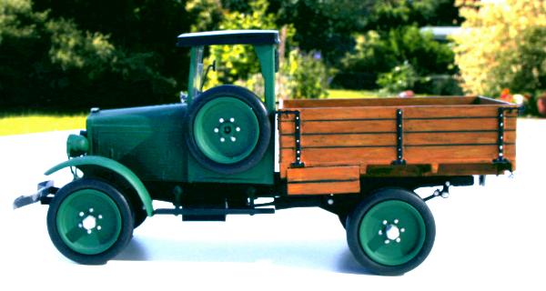 Damals hatte ich das Modell nur einfach so zusammengeklebt, später habe ich es dann wieder zerlegt und in einer Kiste verstaut. Letztes Jahr (2004) sind mir die Fragmente wieder in die Hände gefallen und ich habe mich entschlossen, mal zu probieren, wie mir eine Imitation von Naturholz gelingt - Ergebnis siehe Fotos. Zusätzlich habe ich noch ein paar Dinge, wie Lampen, Stoßstange, Nummerschilder etc. aus der Grabbelkiste angebracht bzw. selbstgebaut.