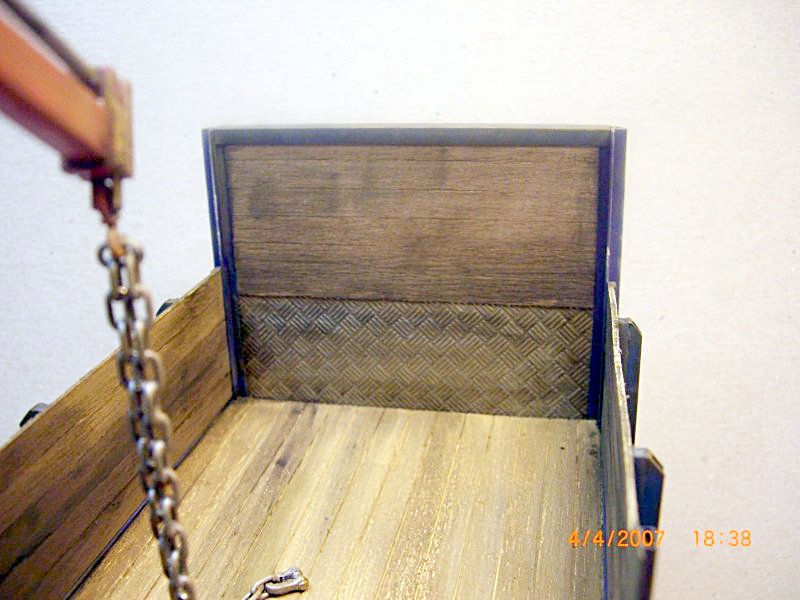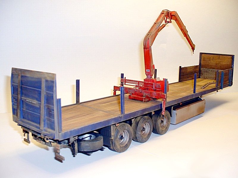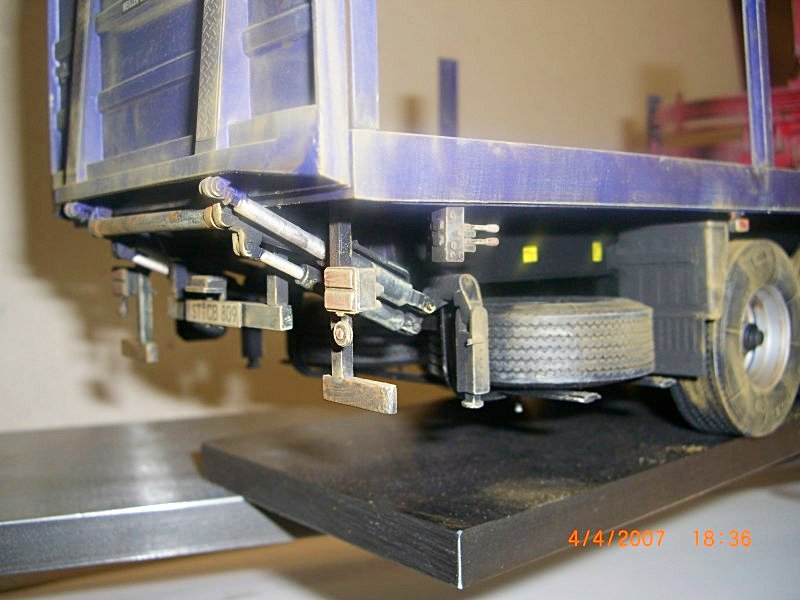 Wenn man ordentlich arbeitet bleibt am Ende alles beweglich, einfach super. Ich ergänzte beim Kran die Hydraulikschläuche aus Kabelhülsen. Mit dem Bau der Ladebordwand verhält es sich wie beim Kran. Zusätzlich fügte ich noch die "Stromleitungen" vorn an der Bordwand, bei den Steckdosen hinzu. Ich brachte noch Ventile in den Stahlfelgen an. Ich verbaute auch einige Riffelbleche die mir als Muster zur Verfügung gestellt wurden. Diese eignen sich hervorragend für diesen Maßstab.