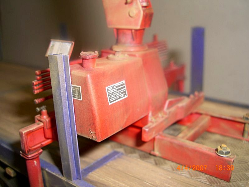Ich benutzte Revell-Farben. Zuerst wurde der Rahmen mit schwarz seidenmatt 302 lackiert. Den oberen Rahmen mit Nachtblau 54. Den Kran spritzte ich in Rot 31.Nun erfolgte ein wenig Aufhellen der grauen Farbe (Highlighten). Es folgte ein kurzes Washing mit schwarzer, stark verdünnter Ölfarbe. Diesmal ganz wenig. Jetzt wollte ich mal die neuen Farben von REVELL ausprobieren. Ich machte noch mal ein leichtes Washing mit Nr.87 und 85 -jeweils mit Wasser+Spülmittel verdünnt. Nach diesem Arbeitsgang erfolgten das Detailwashing mit Umbra und dann das Trockenmalen mit Ölfarbe. Abschließend noch das Modell mit Pastellkreide der Firma Schminke "verstauben".