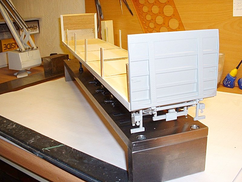 Ich hatte mir den Bausatz Racing Team Subaru von ITALERI gekauft, und im Sommer den Scania-Truck gebaut. Nun sollte der Anhänger folgen. Dabei kam ich auf die Idee einmal einen Plattentrailer zu bauen. Jetzt merkte ich aber dass man den Trailer aus dem Racing Team nicht für diesen Umbau gebrauchen konnte weil er keinen Rahmen besaß. Dieser Trailer besteht komplett aus einen" Kasten" mit Spoilern unten umlaufend. Hier werden die Achsen direkt an den Aufbau angeklebt.