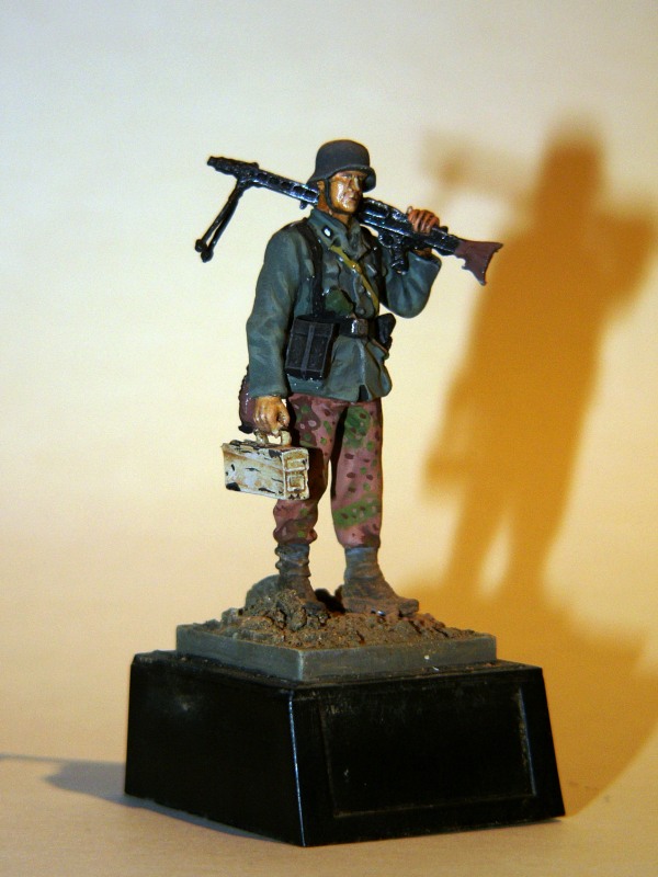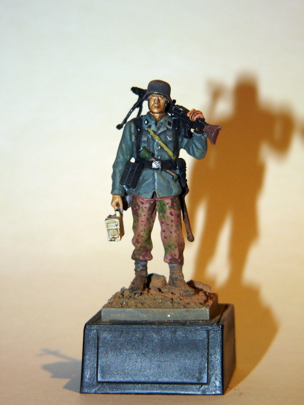 Hallo zusammen, nach 20 Jahren Modellbauabstinenz wurde ich vor kurzem wieder vom Virus befallen und dachte ich fange mal mit etwas Kleinerem (Figur) wieder an. Meine Frau schenkte mir vor etlicher Zeit ein Komplett-Figuren-Set von Andrea Miniatures. Der Inhalt war die sehr schöne Zinnfigur eines MG-Schützen der deutschen Wehrmacht in 54mm und alle Farben, Kleber, Minisockel etc. sowie eine Bemalanleitung, um der Figur leben einzuhauchen. Ein Set, das jederzeit zu empfehlen ist.