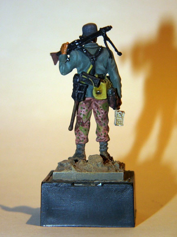 Gesicht und Hautpartien entstanden in Öl. Ich kam hier mit Acrylfarben leider nicht weiter, da mir die Übung fehlt. Die Uniform und der Rest wurde mit Acrylfarben lasierend gestaltet. Es kamen diverse Washings und Pigmente (ich verwende Künstelpastellkreiden) zum Einsatz. Auf dem kleinen Sockel verwendete ich darüber hinaus noch etwas echte Erde, um die Figur mit dem Untergrund verschmelzen zu lassen.