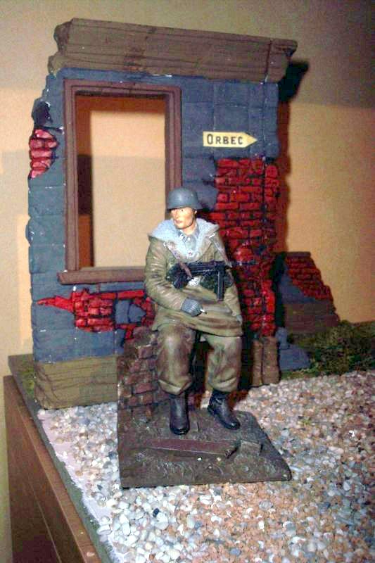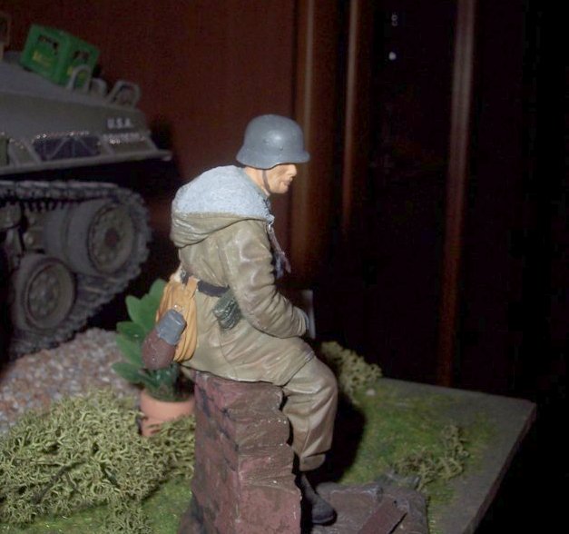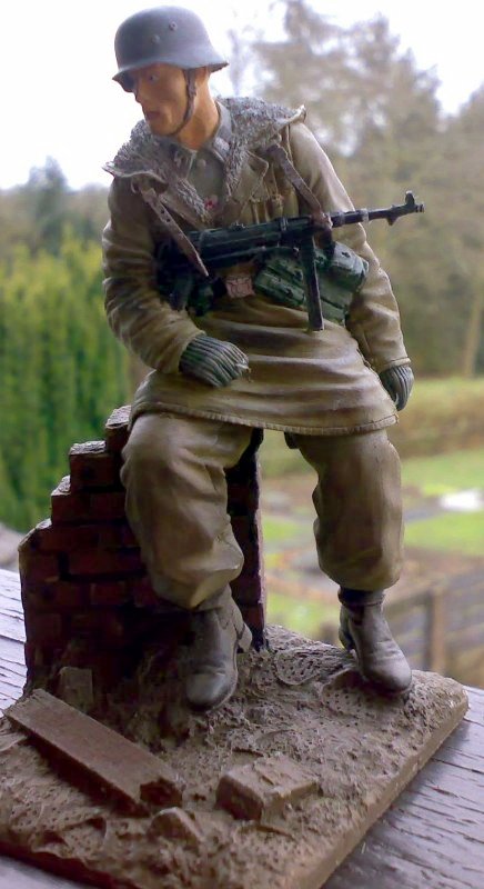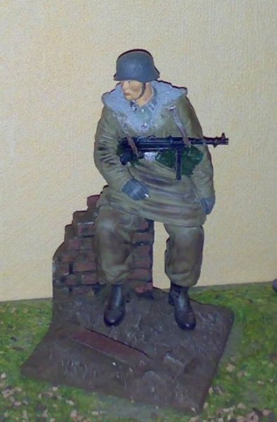 Die Figur ist mit einer selber gemischten Farbe (Freihand-grünlicher Ton) im Ganzen bemalt. Dann folgten die Einzelheiten wie Gewehr, Feldflasche usw. Dazu nahm ich Schwarz matt und Lederbraun von Revell. Danach habe ich sie mit weißer Farbe trockengemalt. Anschließend wurde sie noch mit dem Tamyia Weathering Set verschmutzt.