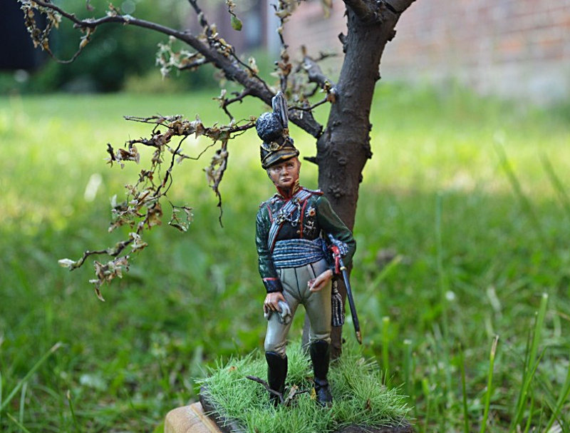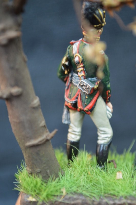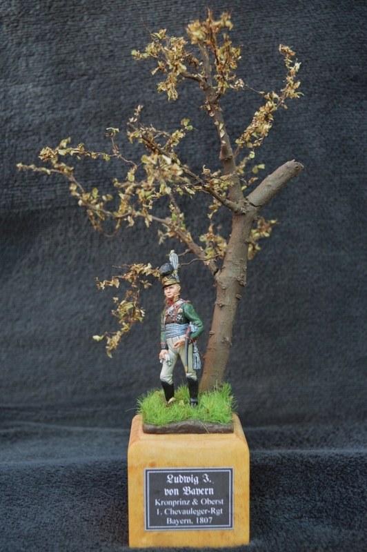 Für den Sockel nutzte ich wieder mein bewährtes Pappelholz. Diesmal verzichtete ich auf die beiliegende Vignette, die mir zu klein war und hielt mehr am Portrait von Kobel fest. Somit fügte ich einen Baum sowie eine kleine Wiese hinzu. Der Baumstamm entstand aus einer Wurzel, die ich im Wald an einem umgestürzten Baum abtrennte. Nach gutem Durchtrocknen sowie dem Hinzufügen von Ästen aus Baumresten und Seemoos behandelte ich alles noch mit Farbfiltern nach, wobei die zenitale Beleuchtung berücksichtigt wurde. Die Belaubung erfolgte mit eingefärbten Gewürzen, hauptsächlich Oregano. Die Erdfläche entstand aus Steckschaum für Dekoblumen, überzogen mit Holzspachtel und Streumaterial. Nachdem diese durchgetrocknet und bemalt worden ist, kamen Statikgras von Noch sowie Reste des oben genannten Laubes hinzu. Zu guter Letzt spendierte ich dem Sockel ein selbst angefertigtes Schild.