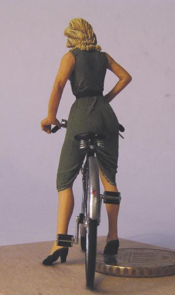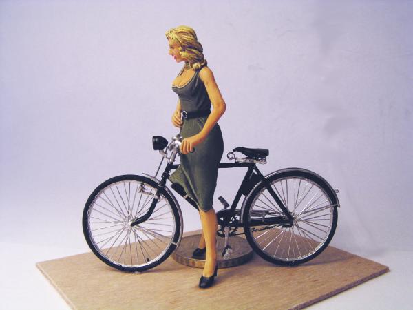 Da das Fahrrad nun jedoch ziemlich einsam wirkte überlegte ich lange wie man es interessanter gestalten könnte. Nach langem Suchen stieß ich auf zwei Figurensätze von COREÉ die schon längere Zeit im meinem Schrank rumlagen. CE- 0059 (Do you wanna ride?) und CE-0063 (Comrade. Mon Amour II). Beide Figurensätze sind sehr schön detailliert und enthalten jeweils eine Frau und einen Mann. Aus dem Oberkörper der einen Frau und den Beinen der anderen baute ich nun eine hübsche Radfahrerin zusammen. Die beiden Teile passten wie angegossen zusammen. Der einzige Umbau der hier nötig war, war das Entfernen des Resinrockes, um die Radfahrerin auf dem Rad positionieren zu können. Da es sich um ein Herrenrad handelt hebt die obere Querstange des Fahrrades nämlich den Rock zwischen den Beinen an.