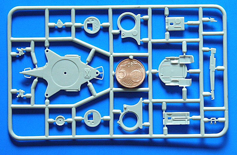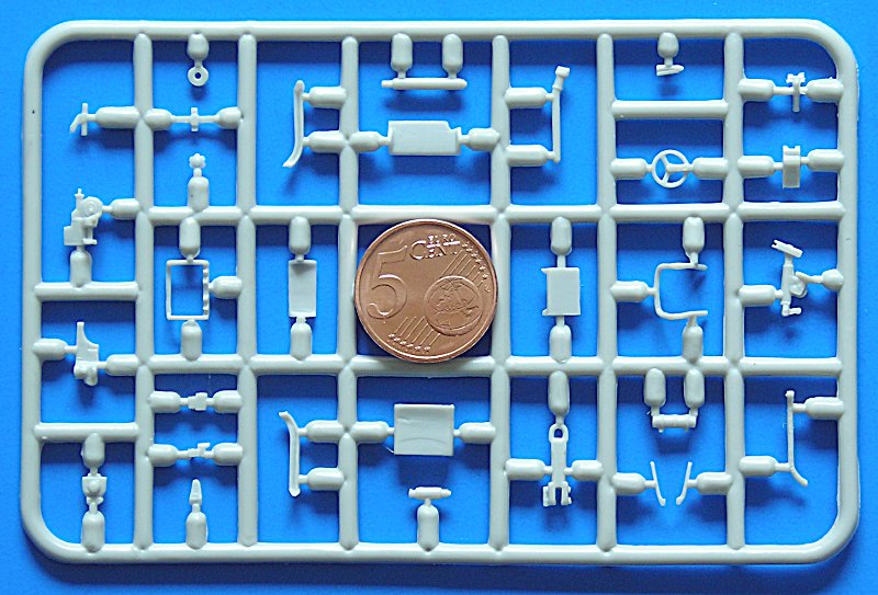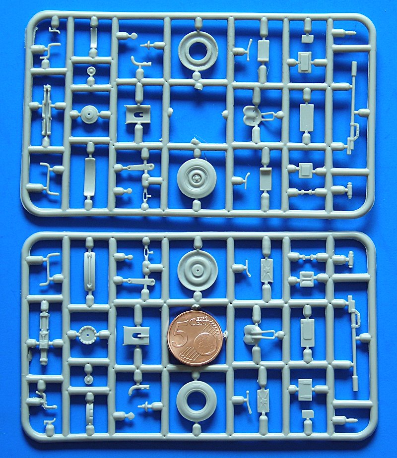 Das kleine Modell soll aus 3 verschiedenen Spritzlingen entstehen, von denen einer doppelt beiliegt. Die Detaillierung ist recht ansprechend, wobei die Umsetzung manchmal etwas grob ausfällt .. eben russisch. Die Bauanleitung lag nicht bei, habe ich aber als Dateien bekommen. Sie wirkt etwas unübersichtlich und ich bin mal gespannt, ob ich das Modell zusammenbekomme. Das es entweder in Transport- oder in Feuerstellung gebaut werden kann, verbessert die Übersichtlichkeit nicht gerade, ist aber eine schöne Option.