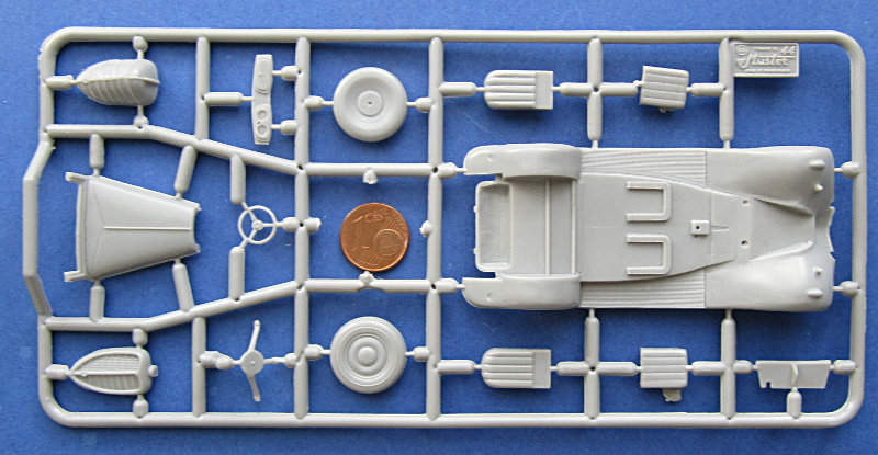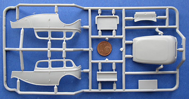 Die Karosserie wird auf einer Bodenplatte aufgebaut. Zwei Halbschalen, das Dach, die Motorhaube und der Kühler bilden die Zelle. Die Naht am Heck verdeckt zu großen Teilen das Ersatzrad. Insgesamt ist die Aufteilung recht clever. Nur das Bemalen mag sich wegen der selbst zu erstellenden Scheiben als etwas schwierig herausstellen. Vielleicht kann man dies jedoch mit einer Farbgebung in Baugruppen umgehen.