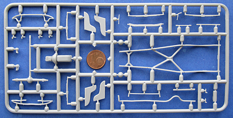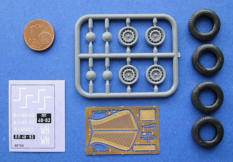 Unter die Bodengruppe wird das Fahrwerk montiert. Die Räder sind gut dargestellt. Auch das Profil der Gummipneus überzeugt. Allerdings habe ich immer so meine Befürchtungen wegen des Materials. Schon oft griffen die Weichmacher das Plastik an oder das Gummi zerbröselt einfach mit der Zeit. Wir werden sehen. Die Ätzteile sind vor allem für die seitlichen Kühlschlitze an der Motorhaube zu verwenden. Aber auch Nummernschilder, Ausstellfenster und weitere Details lassen sich damit darstellen.
