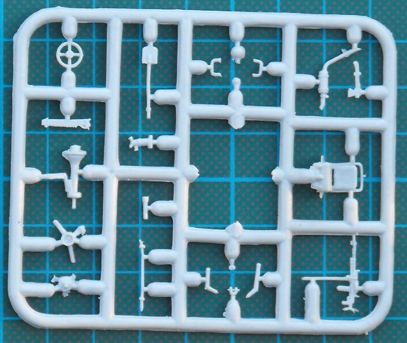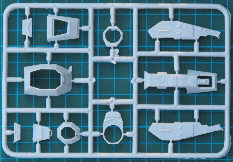 Bausatz: Der kleine zweiteilige Karton enthält drei hellgraue Spritzlinge und einen kleinen Decalbogen. Schnell erkennt man, dass es sich um einen Shortrun-Bausatz handelt. Erstaunlich ist allerdings, dass die Teile verdammt fein sind. Mich überraschten die Wandstärken beim Turm. Sie sind sehr dünn.