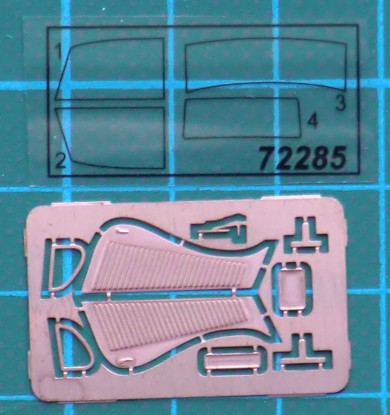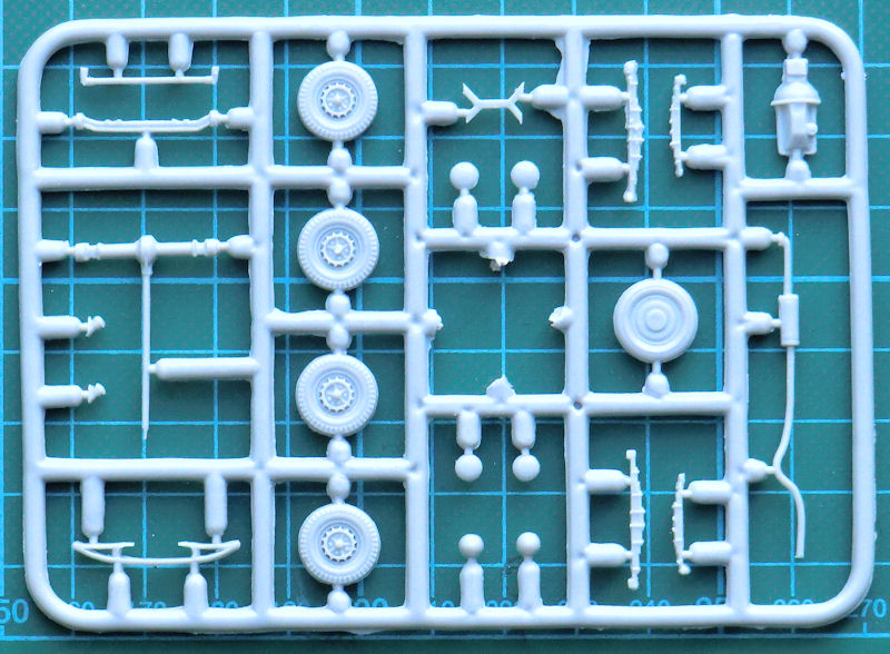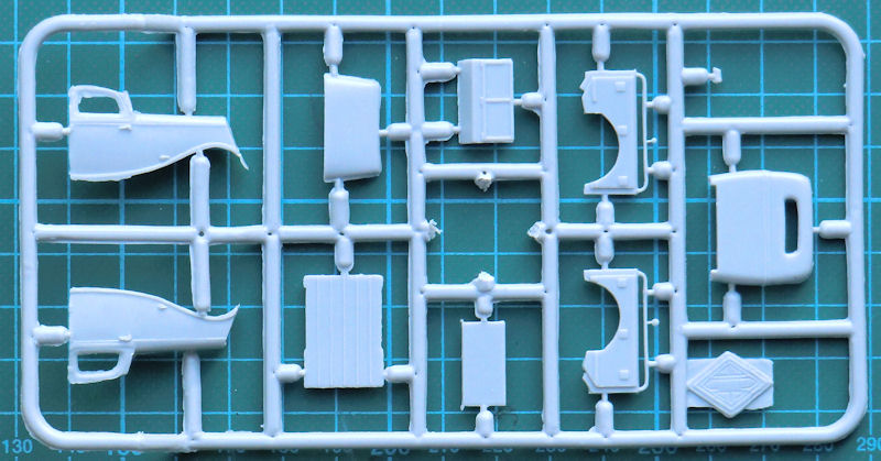 Ungewöhnlich sind die beiden Fotoätzteile für die Kühlluftschlitze der Motorhaube. Sie müssen auf die Kunststoffteile aufgeklebt werden. Auf das Ergebnis bin ich gespannt, denn sie tragen in Materialstärke auf. Die kleine Ladefläche besitzt ordentliche Strukturen und Details. Leider gibt es keine Klarsichtteile für die beiden Hauptscheinwerfer. Einen Decalbogen gibt es nicht. Offensichtlich hat man keine Nummernschilder benutzt.