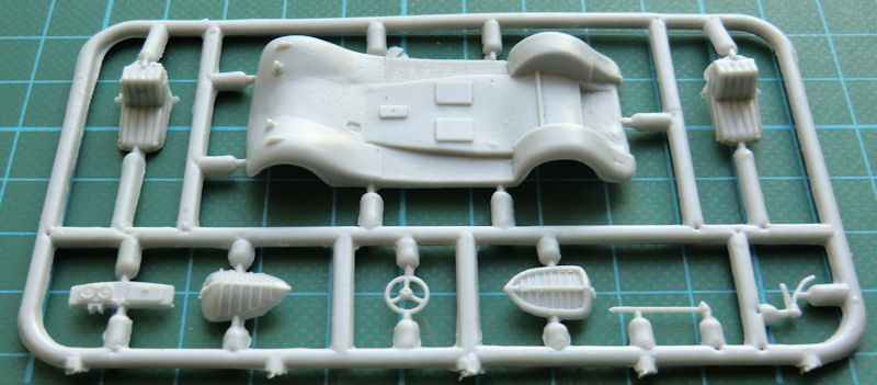 Die Bauteile sind gut detailliert und haben feine Strukturen. Aufgrund der Technologie sind sie jedoch nicht frei von Grat. Das Fahrwerk ist gut mit den vier Blattfedern wiedergegeben. Innen gibt es zwei Einzelsitze, Schalthebel und ein Lenkrad nebst Armaturenbrett. Das reicht fast für diesen Maßstab aus. Die Türen besitzen von Innen keine Details.