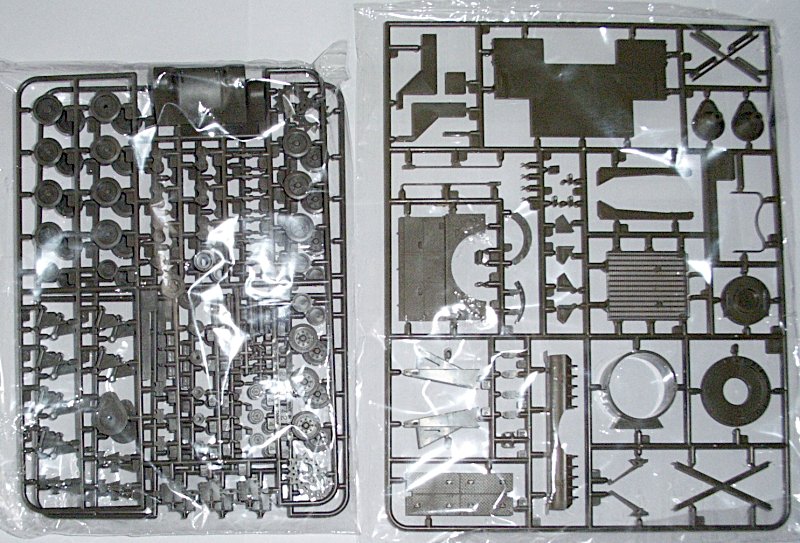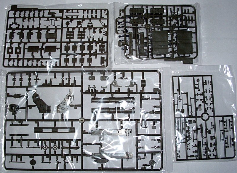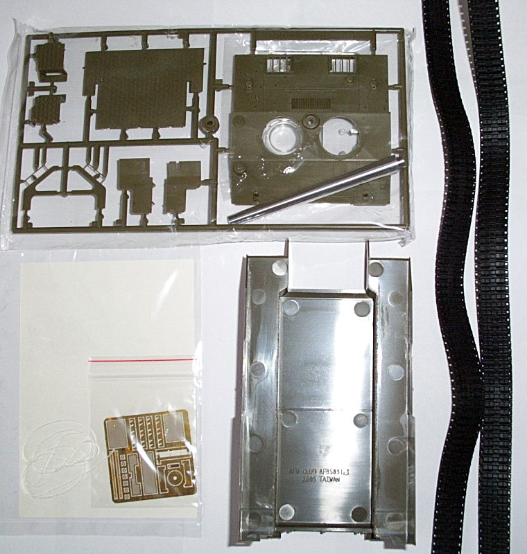 Der Bausatz enthält neben den üblichen Plastikteilen auch einen kleinen Satz Ätzteile, ein gedrehtes Endrohr aus Aluminium, die Fahrer und Beifahrerkuppel als Klarsichtteil und eine Vinylkette. Diese ist von außerordentlicher Qualität, Ich habe keine Auswerfermarken auf der Kette gefunden. Sie stellt eine früher Version der Kette für dieses Fahrzeug dar.