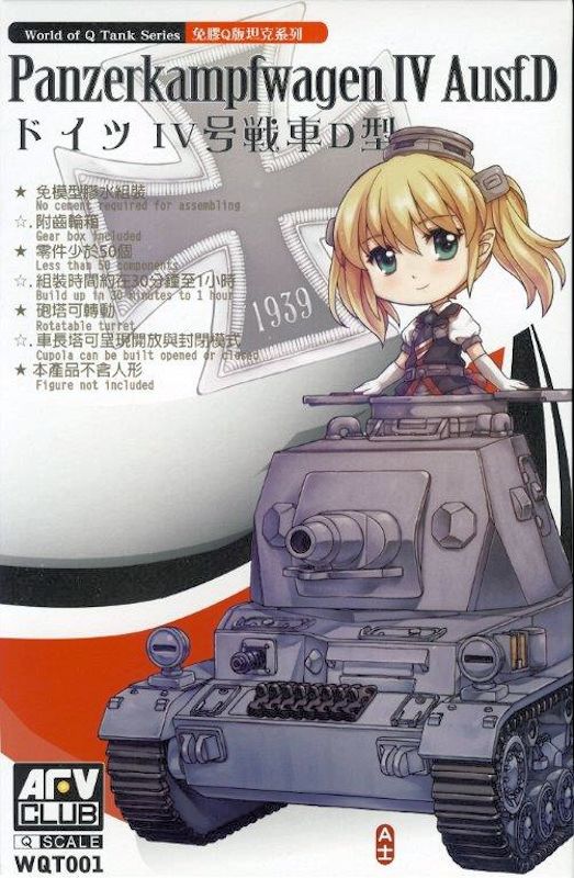 Bausatz: AFV Club erweitert sein Plastikmodellbausortiment mit der World of "Q" Tank Serie. Die Fahrzeuge sind im "Q scale" Maßstab angelegt, soll heißen "eiförmig". Bei den Flugzeugbausätzen kennt man das schon unter dem Begriff "Egg-Planes", die erstmalig von Hasegawa auf den hiesigen Modellbaumarkt erhältlich waren. Als erstes "Egg-Tank" Modell kommt ein deutscher Panzer IV Ausf.D heraus. Maßstabsmäßig dürfte er bei 1:35 - 1:48 liegen und sieht so richtig knuffig aus. Wer möchte kann den beiliegenden Schwungradmotor einbauen und dann mit dem Panzer über den Teppich rollen.