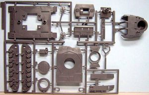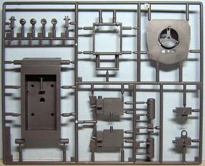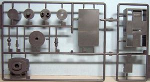 Im Karton befinden sich vier sauber gespritzte Gießäste in grauem bzw. schwarzem Plastik, ein kleiner Schwungradmotor und ein Decalbogen.