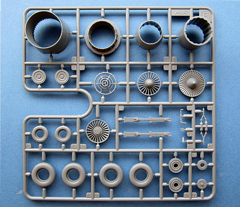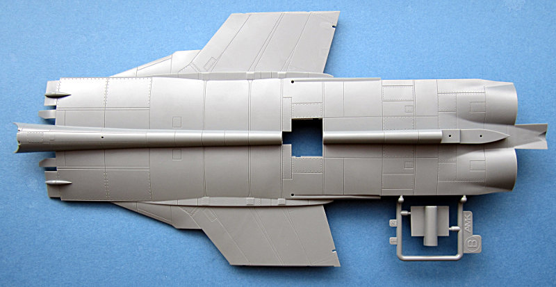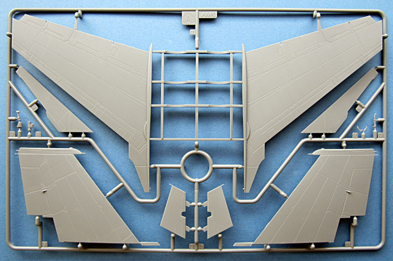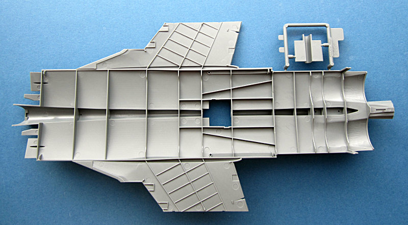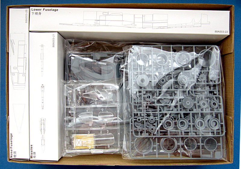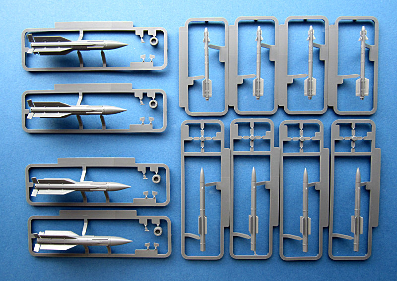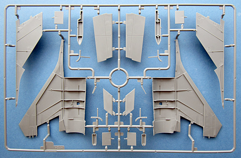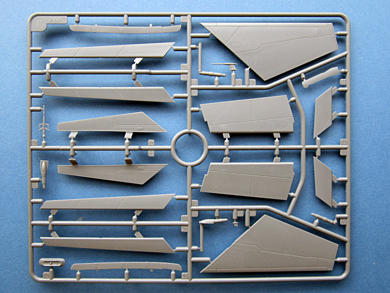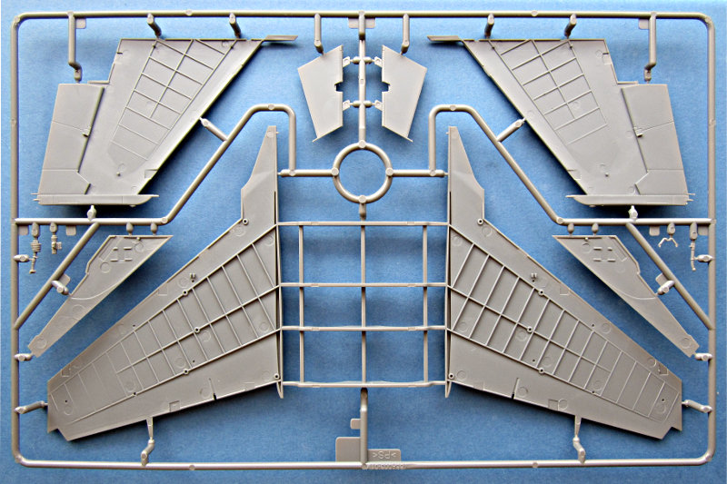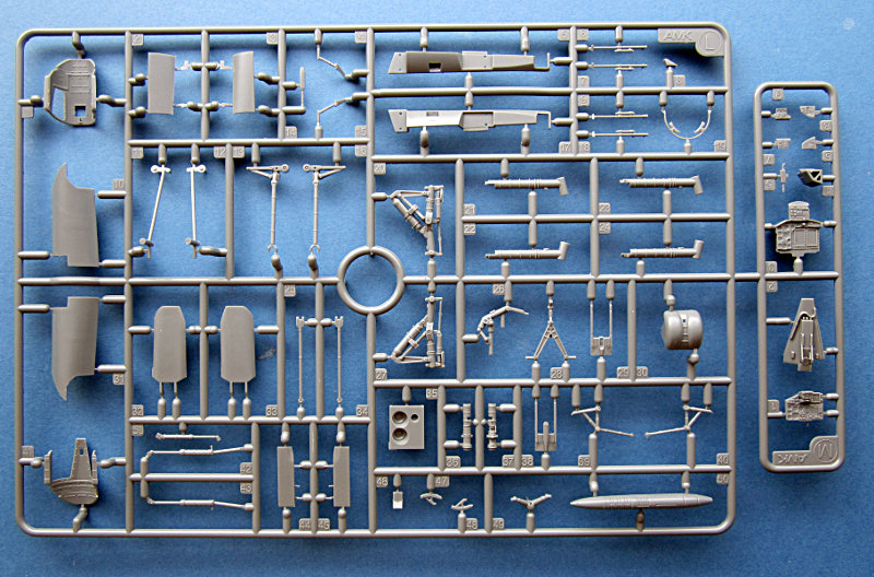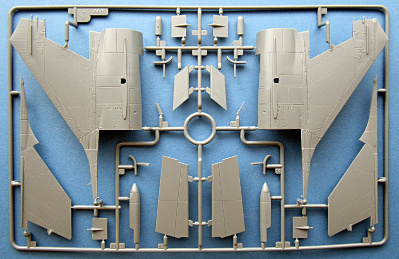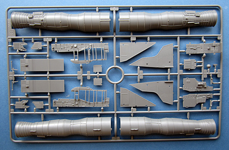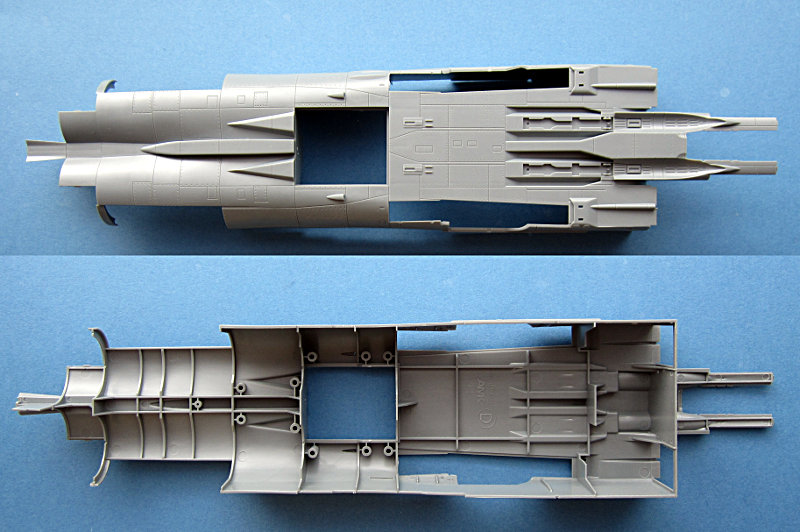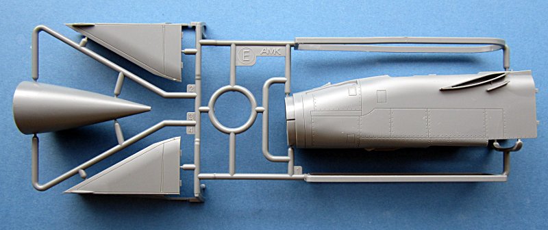 Das Modell wird in und um zwei Rumpfbauteile aufgebaut. Diese haben eine versteifende Innenstruktur, welche sich aber außen nicht durch Sinkstellen äußert, wie dies beim einen oder anderen Konkurrenten der Fall wäre. Der Cockpitbereich und die Nase sind jeweils ein Teil! Das Cockpit wird von Hinten in das Rumpfvorderteil eingeschoben. Triebwerke und Fahrwerkschächte werden in die Rumpfunterschale eingesetzt und sind selbst sehr schön gestaltete Baugruppen. Die Leitwerke sind ebenfalls einfallsreich designed und erlauben die Anbringung der Höhenruder in neutraler oder abgesenkter Position. Sie bilden mit den hinteren Rumpfseitenteilen ein Bauteil und lassen sich so einfach in korrekter Ausrichtung anbringen. Die klaren Haubenteile liegen einteilig (plus Windschutz) für die geschlossene Darstellung der Kabine und mehrteilig für die geöffnete Variante bei. Die Raketenspritzlinge sind ja schon von verschiedenen GWH Bausätzen bekannt.