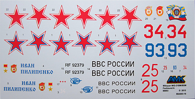Der Decalbogen bietet Markierungen für 4 Flugzeuge der Luftstreitkräfte der Russischen Föderation. Die Decals sehen auf dem Bogen gut aus, allerdings hab ich mit chinesischen decals auch schon Probleme gehabt. Das Blau der Hoheitszeichen und für den Schriftzug ist im Vergleich mit den Decals von Begemot deutlich zu hell. Bei einem Vergleich mit Fotos (Quelle unten) hat sich dies bestätigt, allerdings auch, dass es verschiedene Variationen des Blautons im Hoheitszeichen gibt (ähnlich wie bei den Nummern):