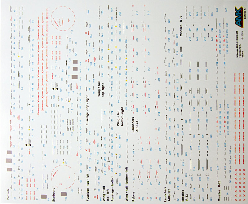 Sehr Umfangreich ist der Decalbogen für die Wartungshinweise. Besonders sagt mir die Platzierung der Markierungen auf dem Bogen zu. Diese sind nämlich nach Platzierungsort am Modell sortiert und erlauben so die Decals Stück für Stück aufzubringen, ohne den Bogen zum "Schweizer Käse" werden zu lassen. Gute Idee! Noch besser wäre nur eine Platzierung am Stück, wie z.B. HGW dies seit kurzem für einige Modelle anbietet, aber das konnte ich noch nicht testen.
