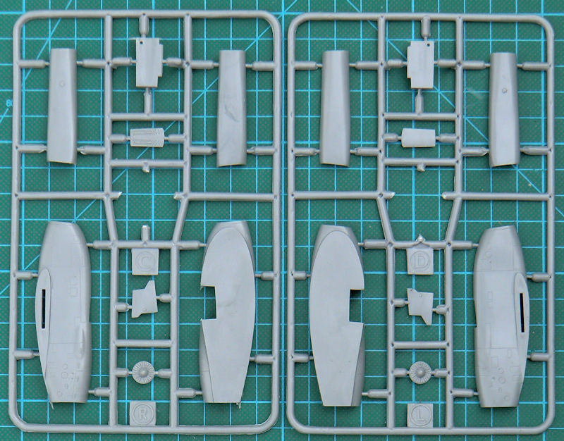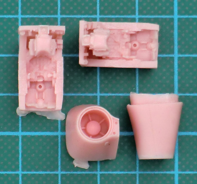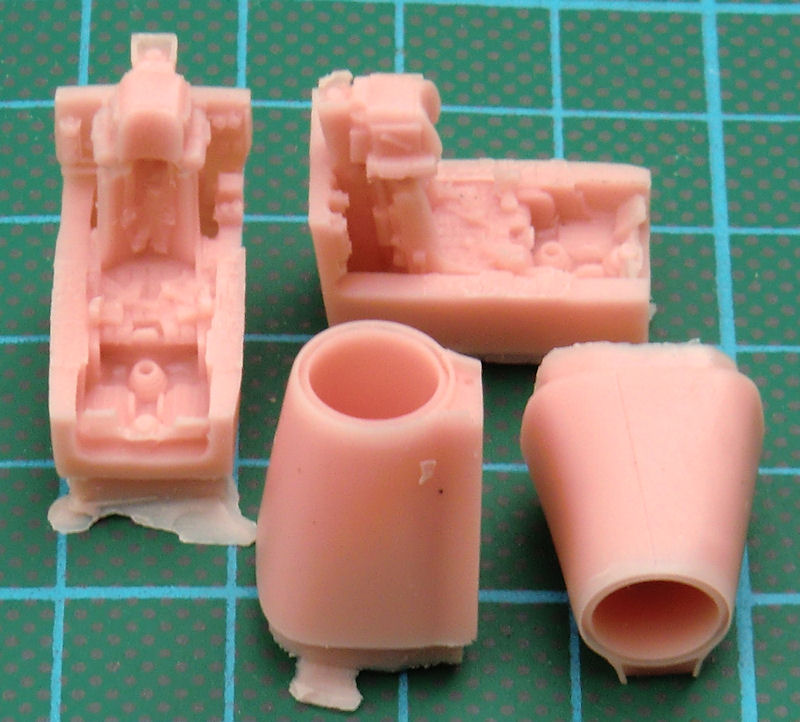 Die beiden Cockpits bestehen aus jeweils einem Resinteile. Wanne und Schleudersitz bilden jeweils ein Bauteil. Auf den Schleudersitzen sind die Gurte aufmodelliert. Dazu kommen noch zwei Steuerknüppel und zwei Instrumentenbretter. Letztere werden mit Decals versehen. Das Bugfahrwerk ist aus einem Stück. Hier hat der Modelleur einen tollen Job gemacht.