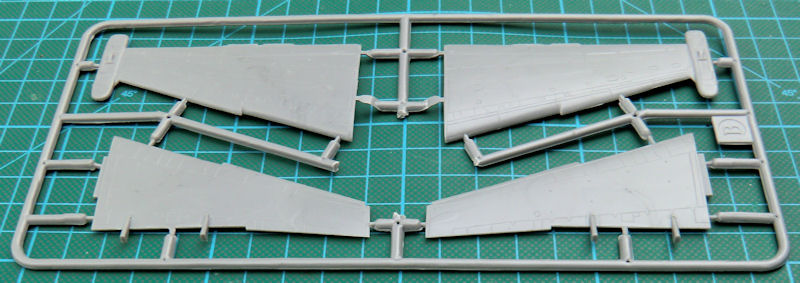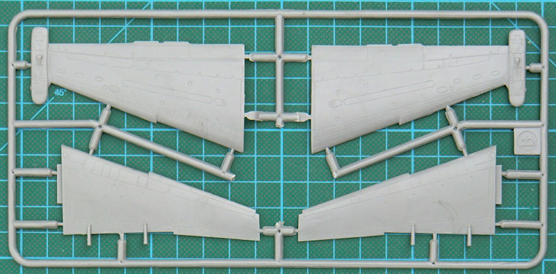Der Übergang zum Rumpf von den Triebwerken ist sehr gut gelöst und die Teile passen gut zusammen. Die beiden Triebwerksauslässe sind aus Resin und haben Innen sowie Außen viele Details (Hier sprechen die Fotos für sich!). Das Seitenleitwerk besteht aus einem Teil und hat eine scharfe Hinterkante. Beiden Hälften des Höhenleitwerks sind auch aus einem Stück. Bei der Tragfläche gibt es vier Teile. Die sind so aufgebaut, dass die Endbehälter mit anmodelliert sind. Hier sind die Querruder und Landeklappen an die beiden oberen Hälften auch gleich mit anmodelliert.