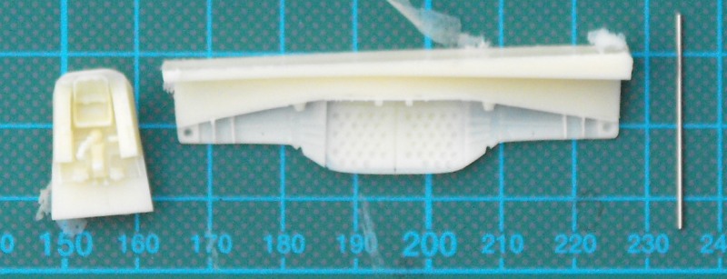Die Querruder sind separat vorhanden und die Höhenleitwerke sind einteilig. Dafür hat man gegenüber dem Sword-Bausatz das Seitenruder wieder jeweils an einer Rumpfhälfte anmodelliert. Der Hauptfahrwerkschacht besteht aus Resin. Das Fahrwerk ist ordentlich detailliert und selbst die Räder sehen gelungen aus. Mit Details hat AZmodel auch nicht bei den Fahrwerksklappen gespart. Die Kabinenhaube ist zweiteilig und kann damit ohne Schwierigkeiten in geöffneter Position montiert werden. Vorher muss noch der Kopfpanzer eingebaut werden. Für die Nachbildung der Bewaffnung gibt es ein Stück Metallrohr.