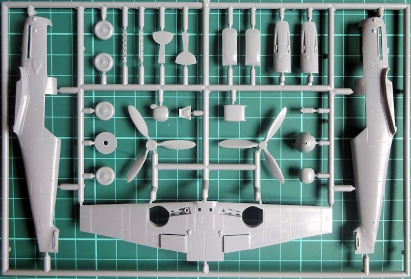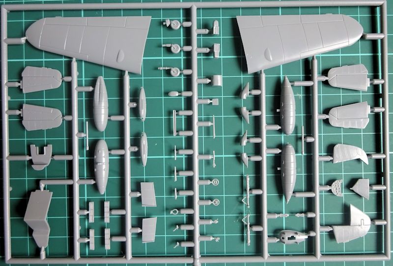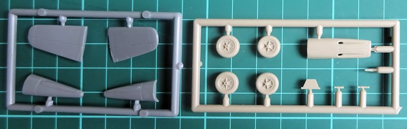 Neben den beiden grauen Standartgussästen gibt es zwei kleine neue. Diese sind für die Räder und das V-Seitenleitwerk gedacht. Für letzteres muss man zur Säge greifen. Die Detailierung der rund 50 benötigten Teile ist gut, der Guss sauber und gratfrei. Wie gehabt liefert der Bausatz weitere 30 Teile für die Ersatzteilkiste. Die Kabinenhaube ist dünn und schlierenfrei.
