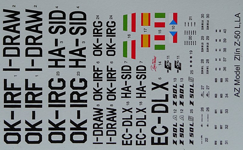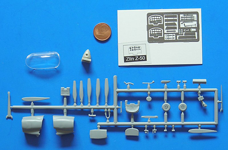 Eine kleine Platine mit Ätzteilen dient vorwiegend der Cockpitdetaillierung. Der Spinner ist in Resin gegossen und die Blätter des Propellers sind am Spritzling. Die Markierungen befinden sich auf zwei Decalbögen. Einem kleineren mit den spezifischen Markierungen der 5 Flugzeuge (leider keine der beiden GST Maschinen) und einem größeren für die großflächige Dekoration der Maschinen. Dieser liegt sowohl der Z-50L wie auch der Z-50M bei. Etwas seltsam finde ich die "silbernen" Markierungen der Unterseite, welche eine Art Negativ zur Oberseite ist (also spiegelbildlich mit vertauschten Farben) .. so ist man gezwungen den genauen Farbton des Rot zu treffen ...