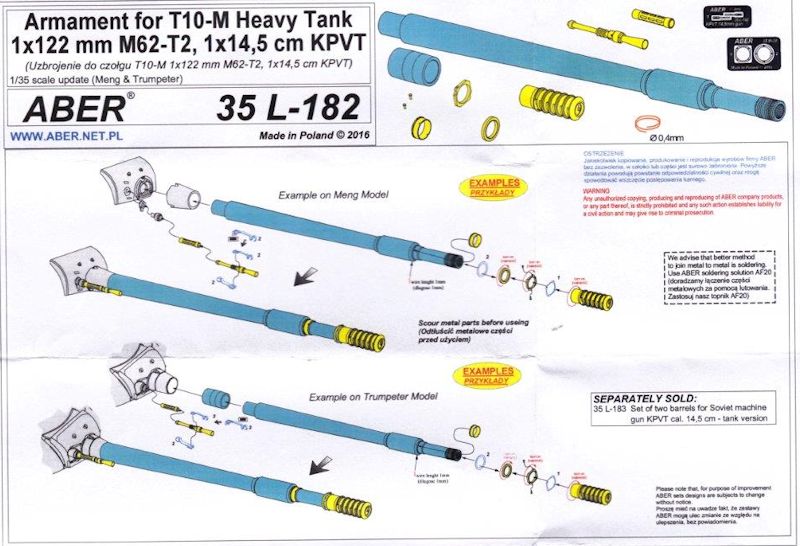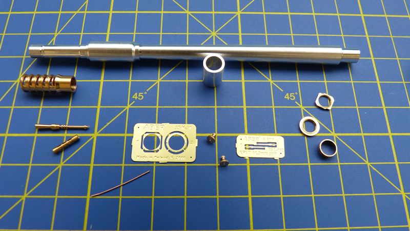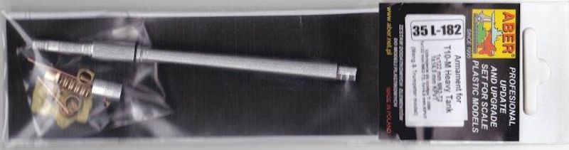 Wer sein Modell des schweren sowjetischen Panzer vom Typ T-10 M, entweder von Meng oder Trumpeter, noch etwas aufpeppen, will kommt an diesem Set von Aber nicht vorbei. Es besteht aus einem gedrehten Alu-Kanonenrohr und einem Zwischenstück, das für das Trumpeter Modell benötigt wird. Des weiteren liegt eine aus Messing gedrehte Mündungsbremse bei. Diese ist hervorragend gelungen. Die Mündungsschlitze sind sehr sauber herausgearbeitet worden. Mit dem innenliegen gefrästen Gewinde wird sie auf das Rohr geschraubt