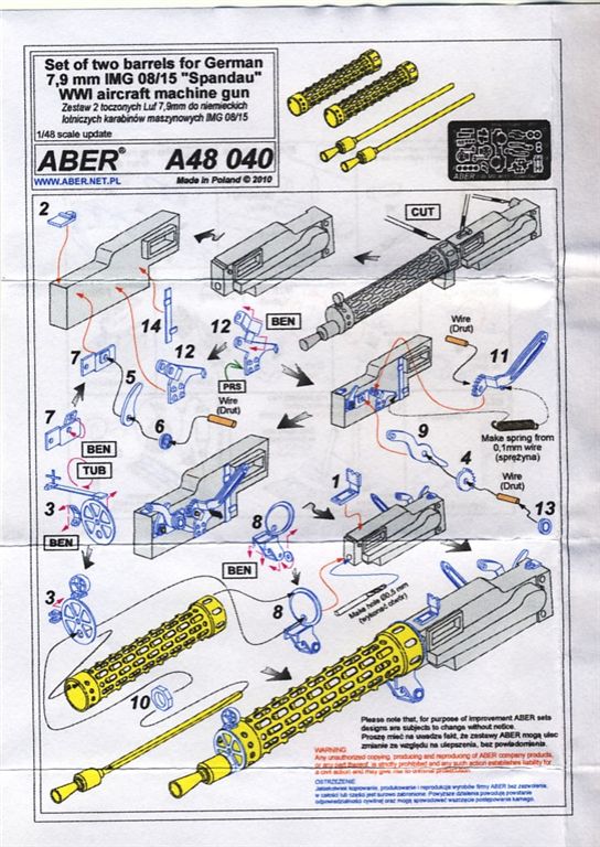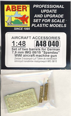 Für die in deutschen WWI Flugzeugen eingebauten legendären „Spandau“ 7,92 mm MGs, bringt ABER für den Maßstab 1:48 in Messing gedrehte Gewehrläufe und Kühlmäntel heraus. Im neuen Set sind je zwei Läufe, zwei weitere Zusatzteile und Kühlmäntel enthalten. Mit diesem neuen Zurüstsatz können sinnvoll die doch recht einfachen in Plastik gefertigten MG-Läufe ausgetauscht werden. Da es recht viele deutsche WWI Flugzeuge im klassischen Maßstab 1:48 auf dem hiesigen Modellbaumarkt gibt, wird es den Modellbauer nur erfreuen, wenn er diese wirklich klasse gefertigten „Teile“ von ABER einbauen kann.