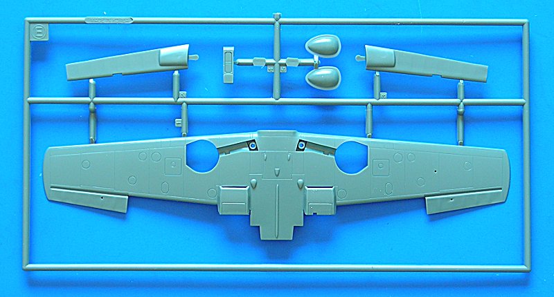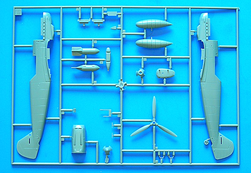 Zum Schachtelinhalt. Der Bausatz ist sauber in einem blaugrauen Material abgespritzt. Mir gefällt diese Farbe nicht so ganz als RLM 65, es bietet aber dem Anfänger die Möglichkeit ohne großflächigen Farbauftrag zum fertigen Modell zu gelangen (lediglich im Cockpit und bei diversen Kleinteilen muss dann der Pinsel geschwungen werden. Möglich macht dies die Beigabe der Tarnung als großflächige Abziehbilder:
